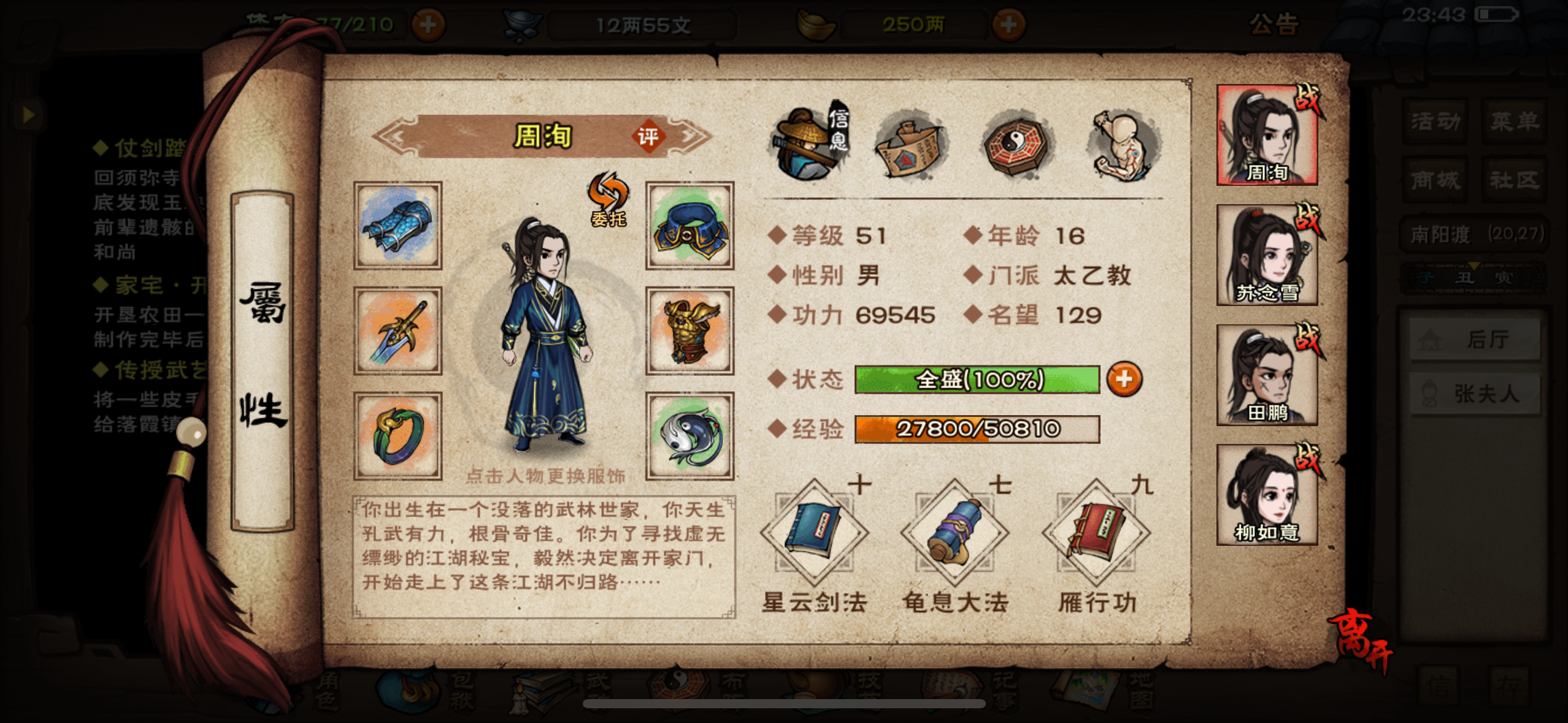 这是一份零氪开荒攻略,书写时间是2025年12月3日。观看时请注意时效性。前情提要:男号,零氪。判门路线天刀——苍狼——太乙——少林——极乐。开局选择天赋【跋山涉水】,其他无所谓,我是输出主所以选择臂力和身法尽量高。进入游戏跟随指引,睡觉之前(26,15)搜索(点击后院,弹出搜索选项)睡醒跟随剧情对话庄主,找陈师傅学武功,顺便对话两次。买酒回来学武功,影响不是很大,后续涉及到一把十级武