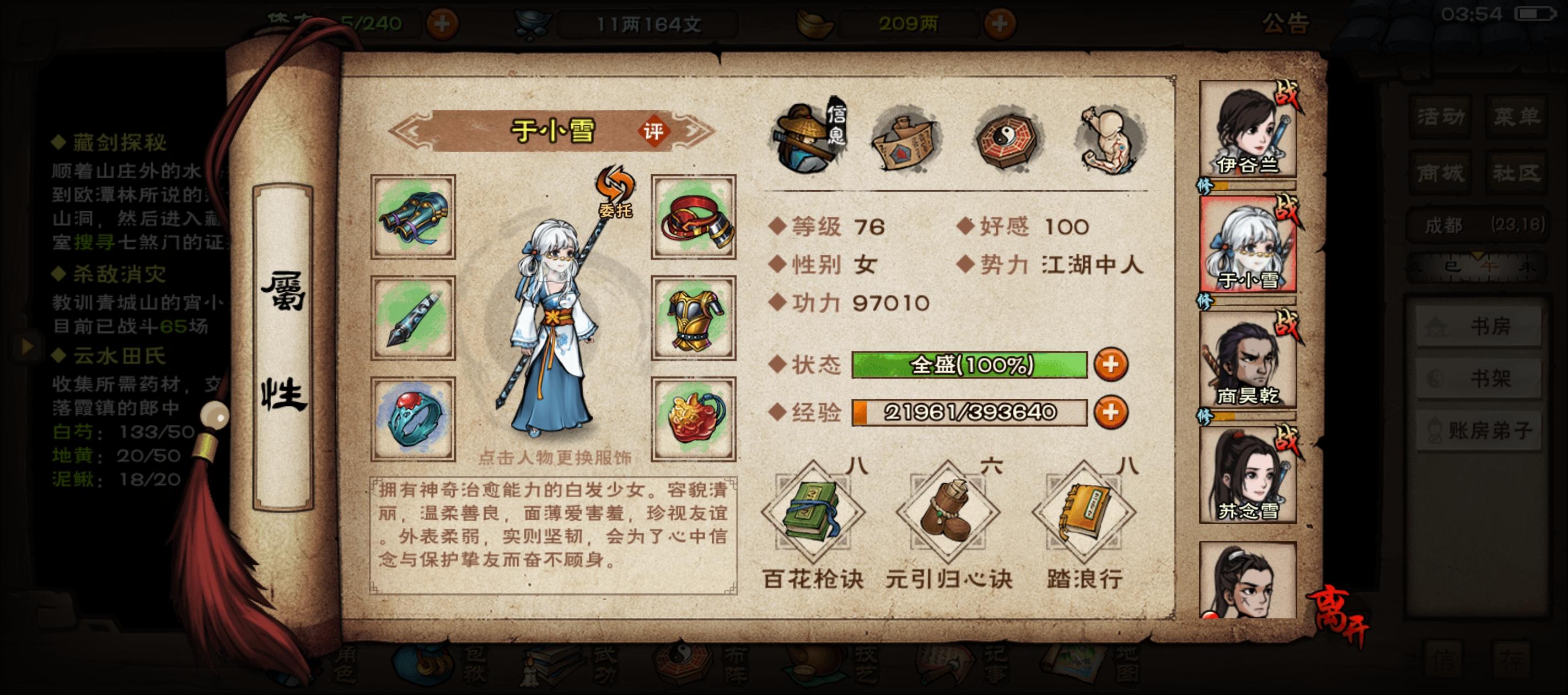 前言:碧波神功和碎星步,凌波微步和太玄神功一般不考虑。一般篇主角武学一直用门派的(进阶内功用浑天气功),轻功早点学到雁行功9重(优先)和水上漂9重一般刀法建议打洛阳左上角的洛龙村的周石天(6,3)掉落的流云刀法。剑法→孙邪的点墨剑法枪棍→用武馆的齐眉棍法拳脚→武馆的太祖拳法(或更强的铁砂掌,不过铁砂掌无法传功,需要慎重)内功先每人(判门主角除外)一本气引术(3重满)和吐纳功(3重满)