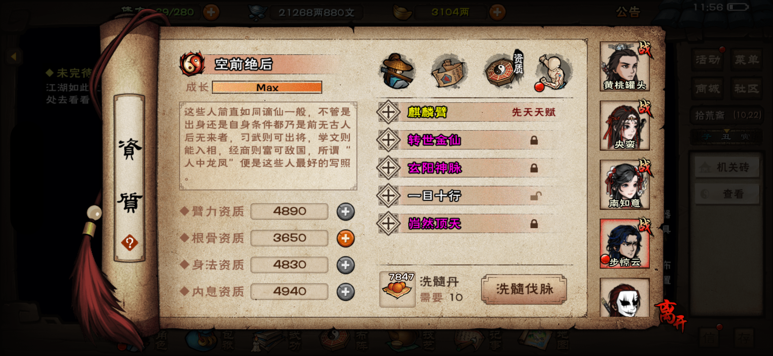 现在已经肘赢了寇马,卡在了葛病。技艺主角:寒引术不动明王白浪如山守御术陶溢渊:朝花夕拾笼斗术闻涛八段锦萧佩吟:红拂袖轻鸿术九幽引柳絮飘劲于小雪:紫阳心经淬毒术(噬心散)千斤坠金刚拳劲