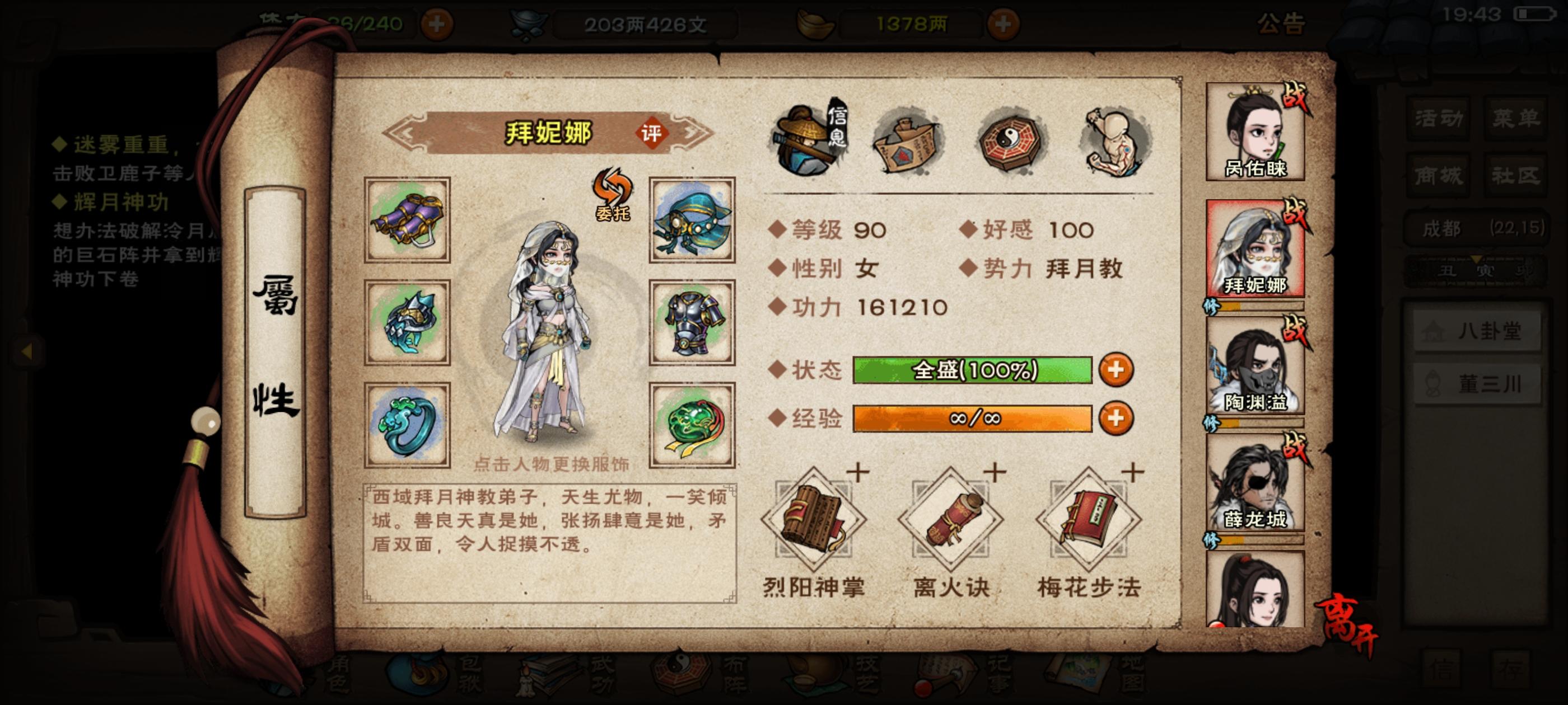 刚刚回归继续玩,月卡党没怎么充钱,原来做好远期沉淀计划还买了丐武圣结果没坚持住,目前进度是勉强过枯骨门,重新捡起来有点迷茫,正在加强经脉这一块,装备和天赋暂时搁置沉淀,陶过年应该是要换个更肉的,其他俩随从应该不会换,请教一下下一步要去弄什么武学。(特别是拜,退坑版本看攻略说T0奔雷拜妮娜,现在用的烈阳感觉也太拉了,是不是要调整一下)望各位大佬不吝赐教,为在下指一条明路。