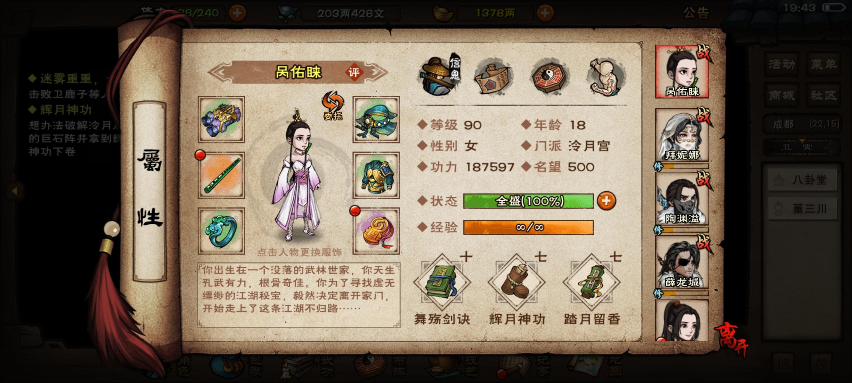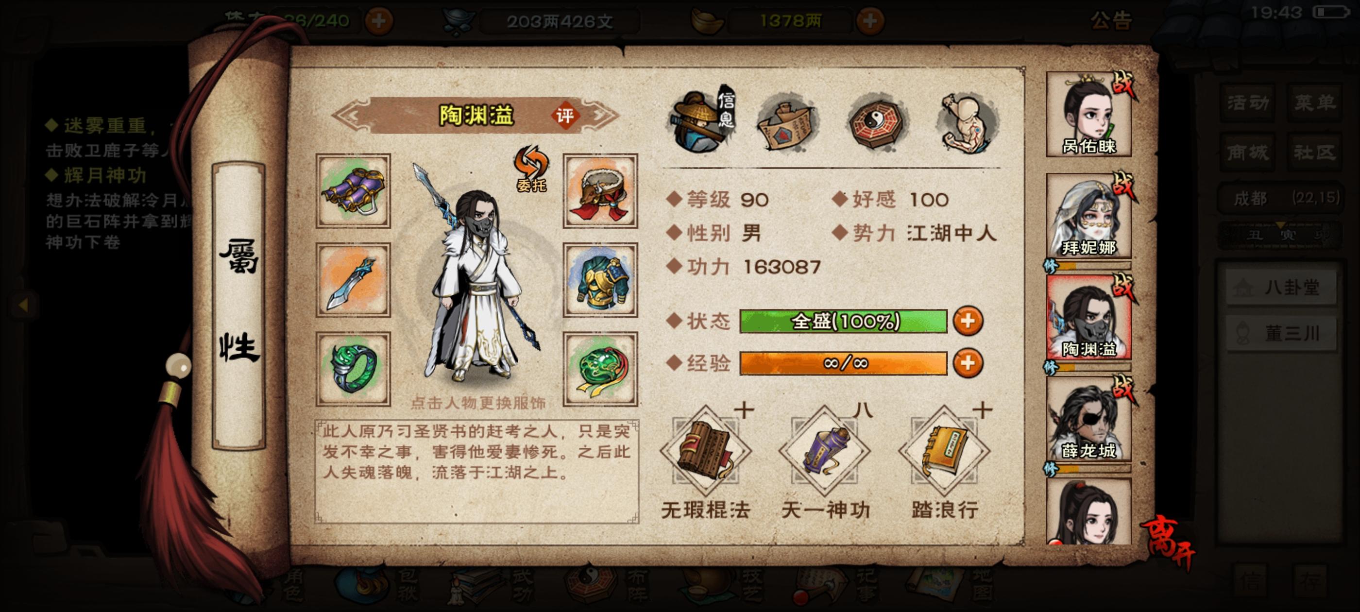 太阴拉满了,但是感觉并没有太好用,虽然回蓝看着挺爽,但输出感觉一般般,协战拉到60%概率,实际上30%都没有吧。。东方朔换回天刀过的,厂狱老三也是换天刀过的。另外刚刷到一个74w就道小速厂狱的,我™87w还艰难到刷了两次厂狱就不想刷了。。是不是该换玩道小了现在配置:90级,加点随时能改,拘魂有兵器论要,秘技差大风+武学差逍遥游(极乐差10重刀、2重天外天和两个秘技想拿完再去剑王),主角天赋混金