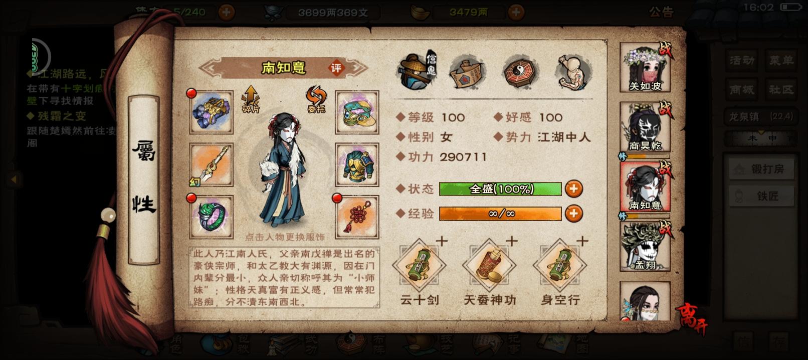 1.柳如意的妹妹,柳如心。在如意的剧情里是化名为朱小蝶,所以不用怕名字会有冲突,他曾经是药王谷叛徒离道的徒弟,所以设定为会湘西赶尸或茅山术的女天师,天赋“回光返照”,复活最早阵亡的队友,因为是活死人,感觉不到痛所以不会招架,但不会留手,暴击率增加,随机上debuff“尸毒”。“尸毒”叠够五层,令中毒者变僵尸,亦不会招架,不能放技能,普攻随机攻击队友。2.南宫仙羽的女儿,南宫残花南宫仙羽,自小