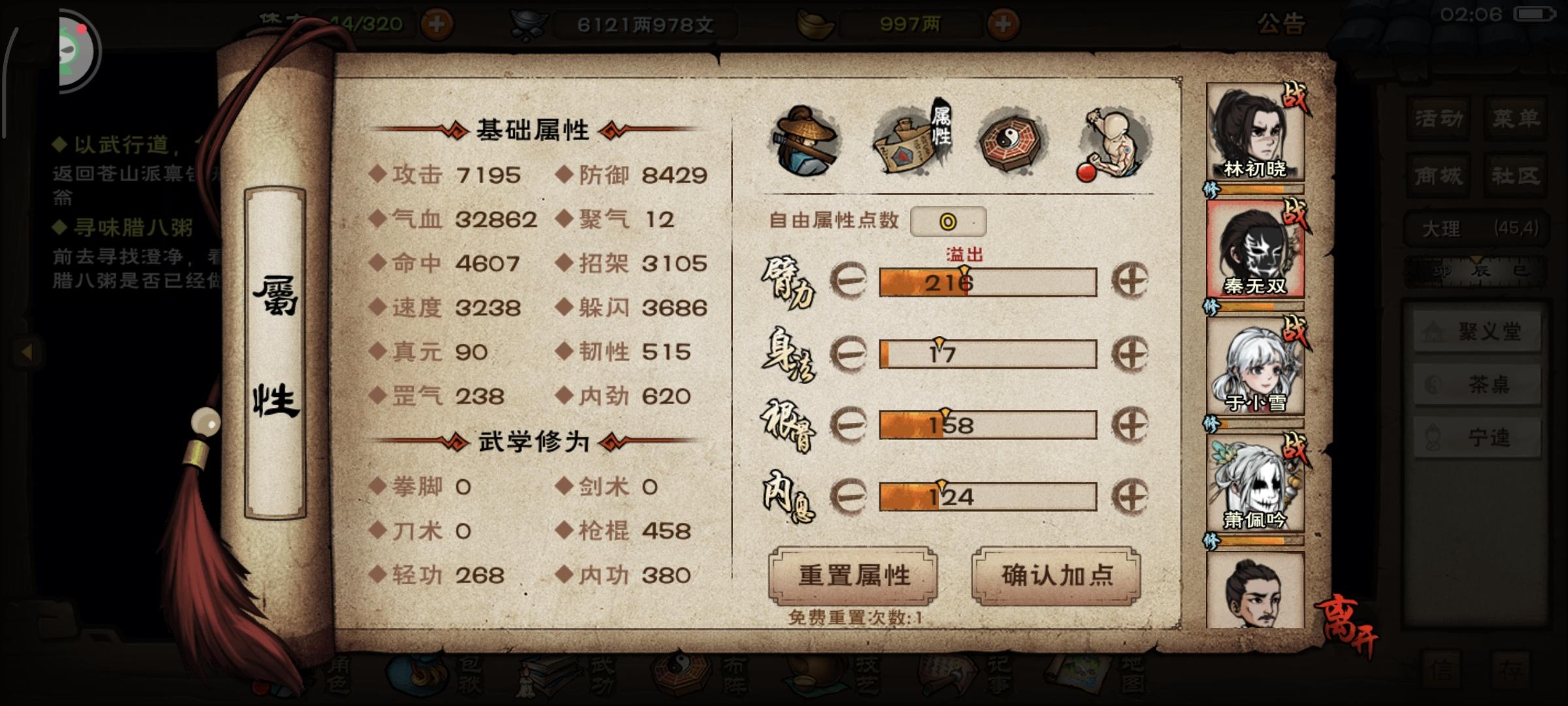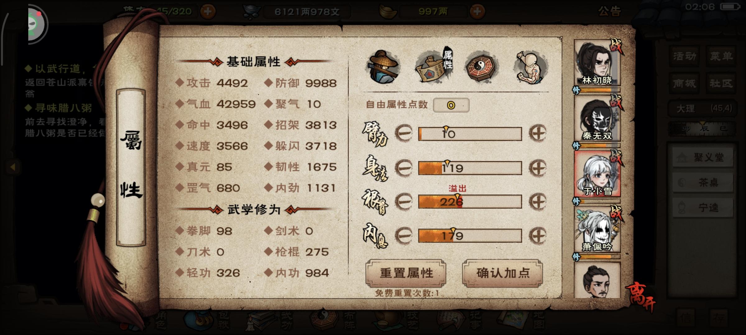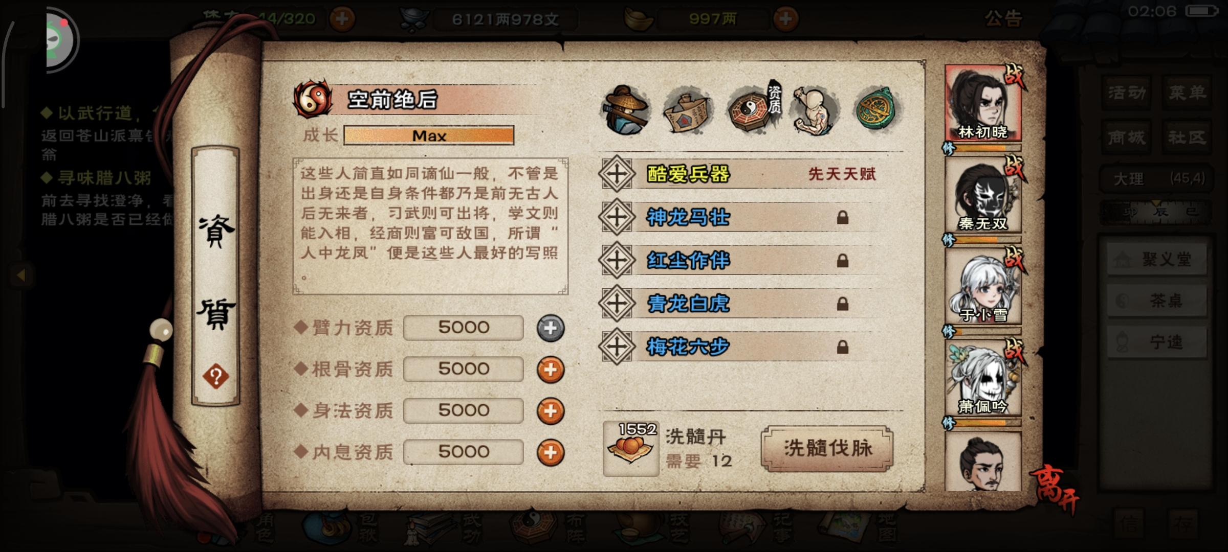 之前忙着考试没时间玩,四棍号鸽了两个月,放假知道萧大加强也是第一时间下回来了,今天一试,用了一个多小时拿下武神殿绝世,破狼还是好用啊,可惜出的太晚了。附上面板截图,个人觉得李子最难,主角容易暴毙(没喝腊八粥,不然不用凹这么久),然后其他都还行,诸葛比较看脸,稀里糊涂就过了。最后附上面板截图,晚上熬夜去建设恒山去了#烟雨江湖四棍 #烟雨江湖开荒
