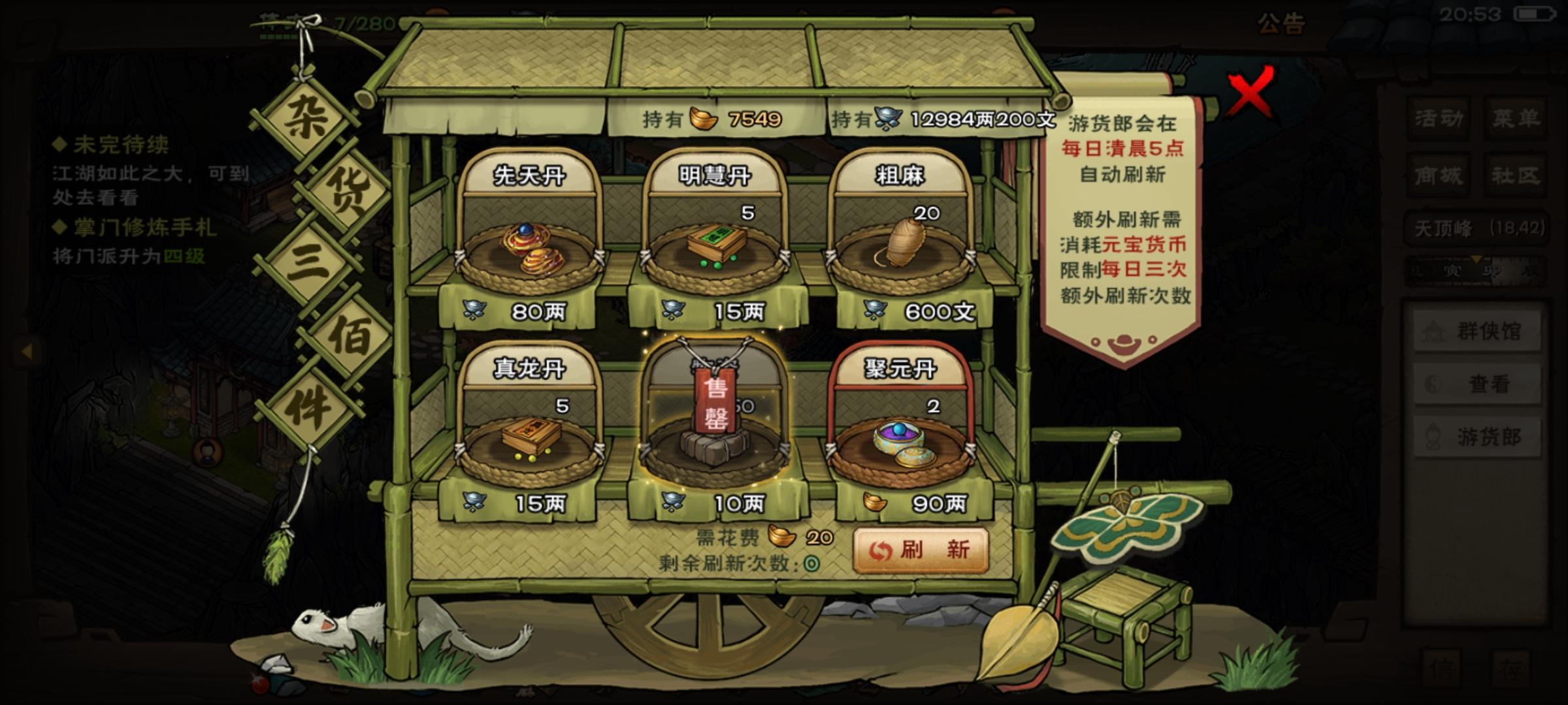 65级 身上107两银子 优先买哪个功法或者技艺?六扇门的天刀 商 柳 鹏的配置 6000多元宝 应该买哪些随从?谢谢各位大佬