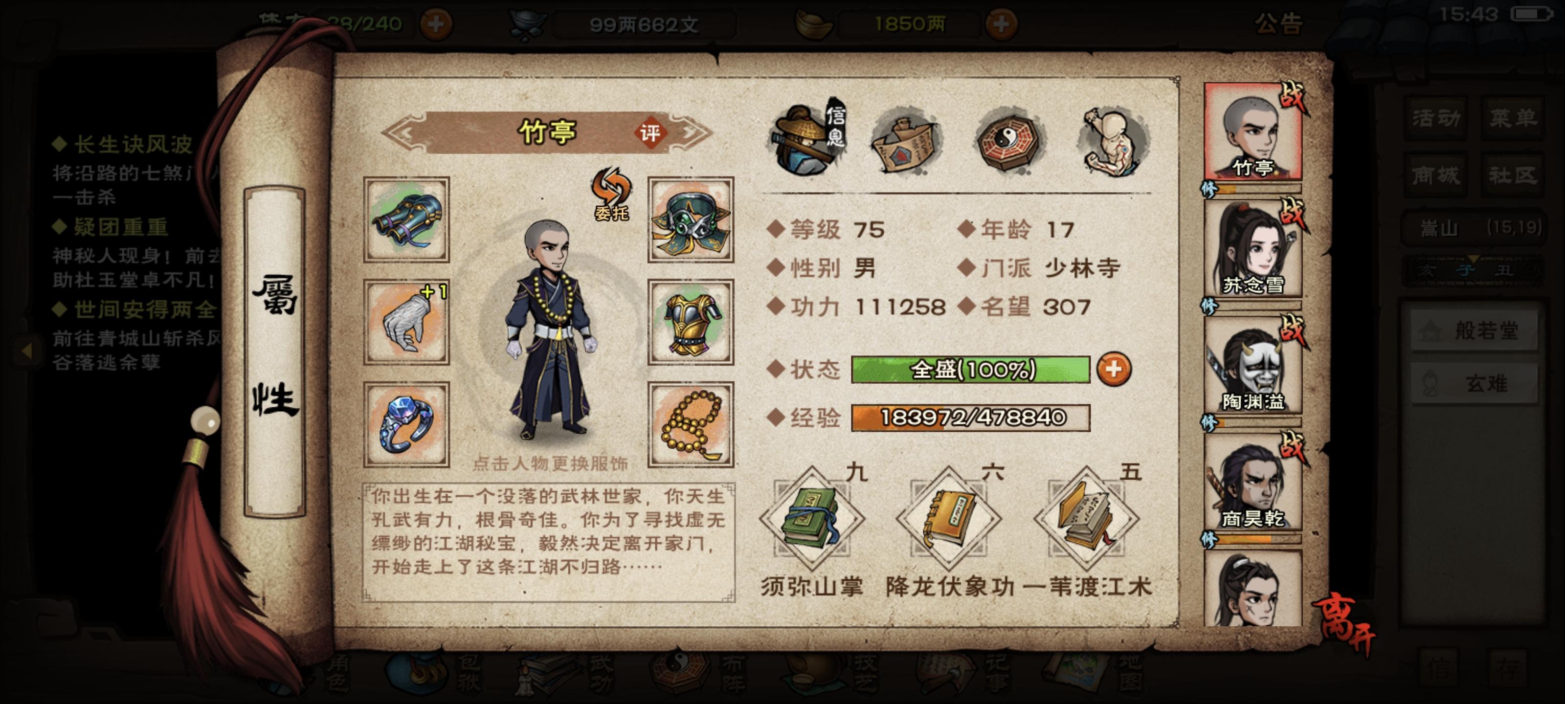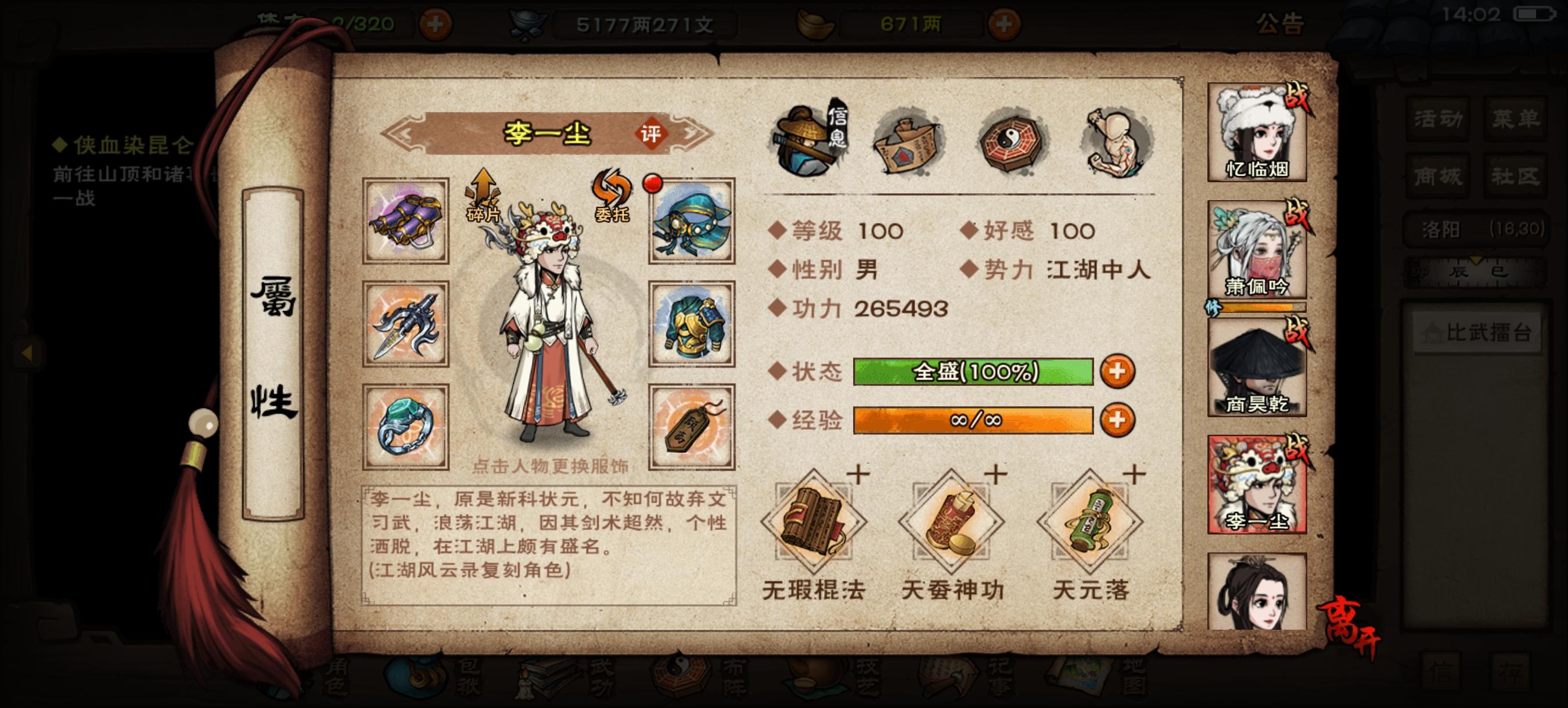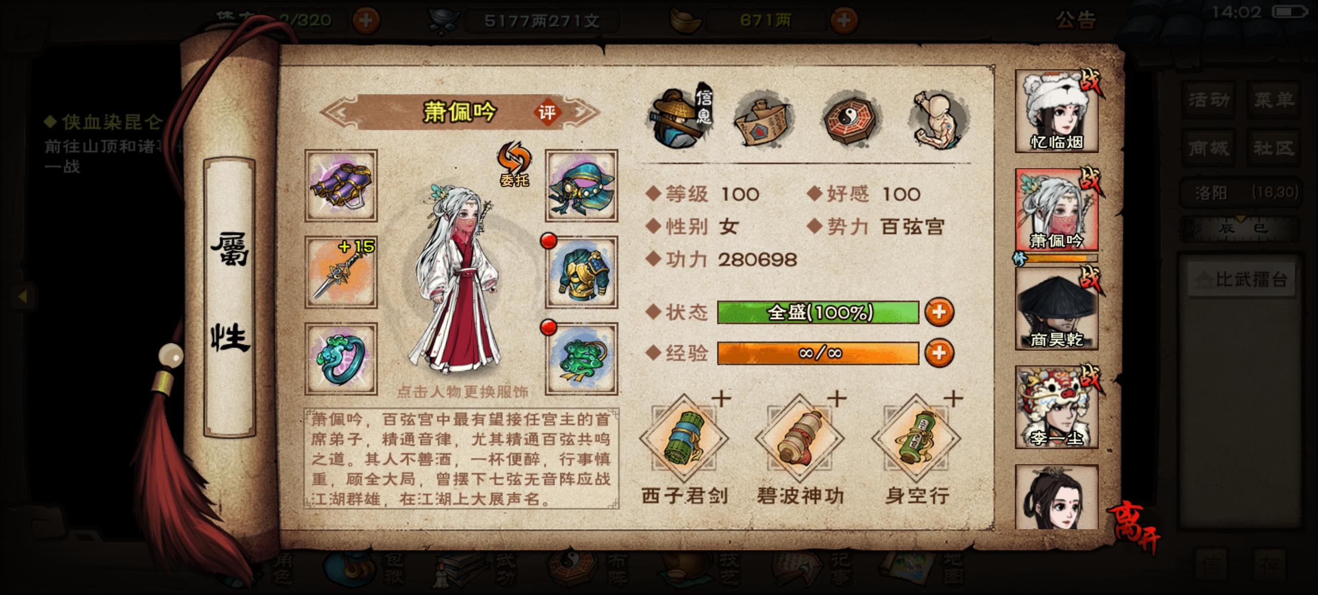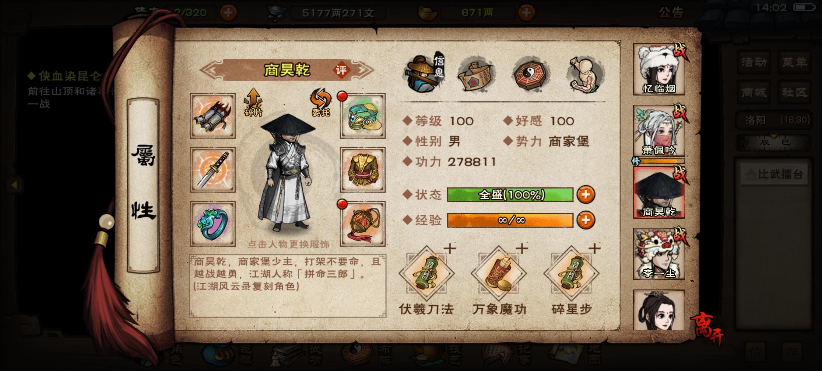 弃坑一年看见萧妹妹加强了的回坑玩家,首通即速通,极限76回合前天通关夜天子,然后被卡奇人庄贡献拿不到五秘技最后打诸葛刚好97层绝世气息吓死人。然后现在的问题是,我打不过闻香教一个boss都打不过