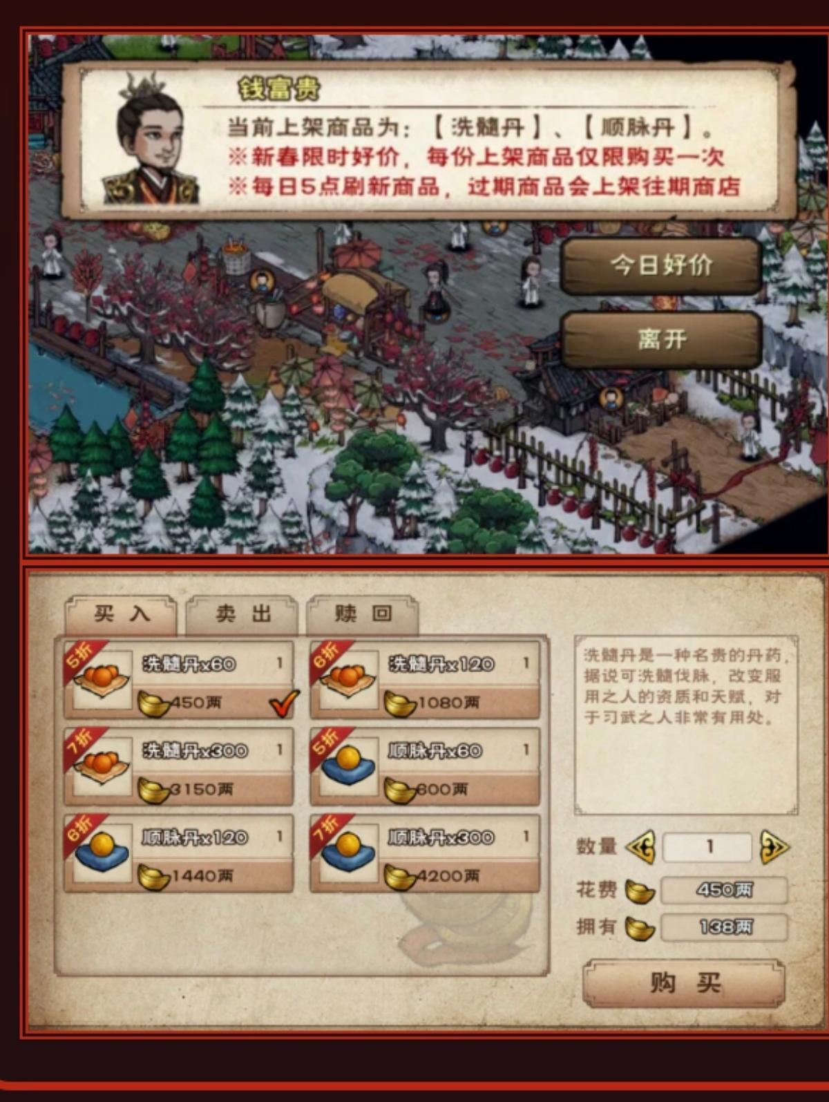 我看着的只能购买一次,然后还每天刷新?没太理解这个描述,就比如5折的洗髓丹,是说每天可以买一次然后每天更新,还是只能买一次啊?