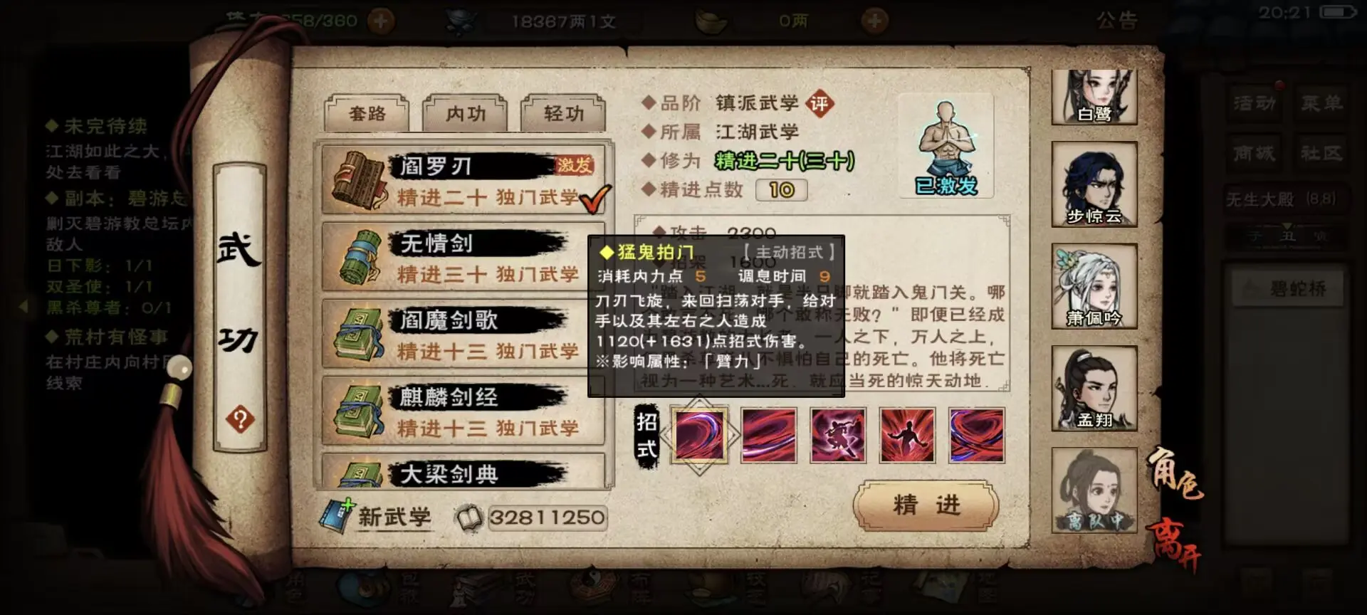 准备判门去极乐学奶指,主剑(目前野外副本拳法全在身上)桃剑(野外副本剑法全在身上)央刀(野外副本刀法全在身上)南棍(野外副本棍法全在身上)