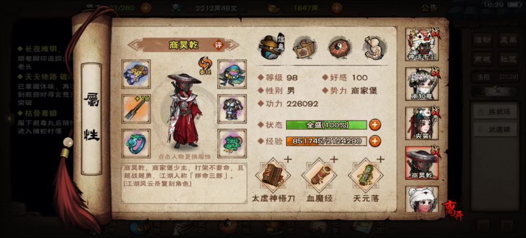 我感觉老商越来越不好出伤害,但是老步我又没什么资源培养,他要培养的话又得等很久,但是我现在正好卡bug时间很够,我在想要不要退出极乐谷先去天刀,把所有的秘籍跟天刀学完,再等三个月回极乐过碧游,因为我发现我的随从和主角玩刀什么秘籍都没有。