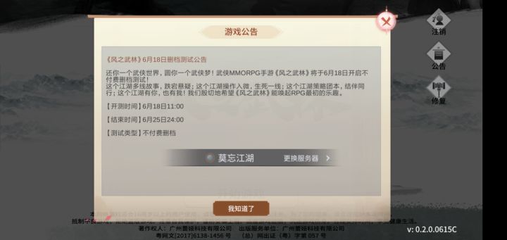 《风之武林》6月18日删档测试公告