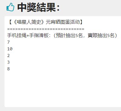 《喵星人简史》元宵晒图鉴活动结束啦!新的一年已经正式步入正轨,大家都忙碌起来了吧。凌编依旧会定时给大家送上福利活动的哦。以下是中奖玩家的信息,和抽奖截图凭证,请注意领奖方式:恭喜以上5位幸运儿,每人获得手机挂绳和手指滑板一套!领奖方式:1、确认中选后,请中奖的玩家请添加《喵星人简史》官方群868594752,找管理员“凌编”进行领奖。2、届时需要提供TapTap 楼层截图或OKJOY
