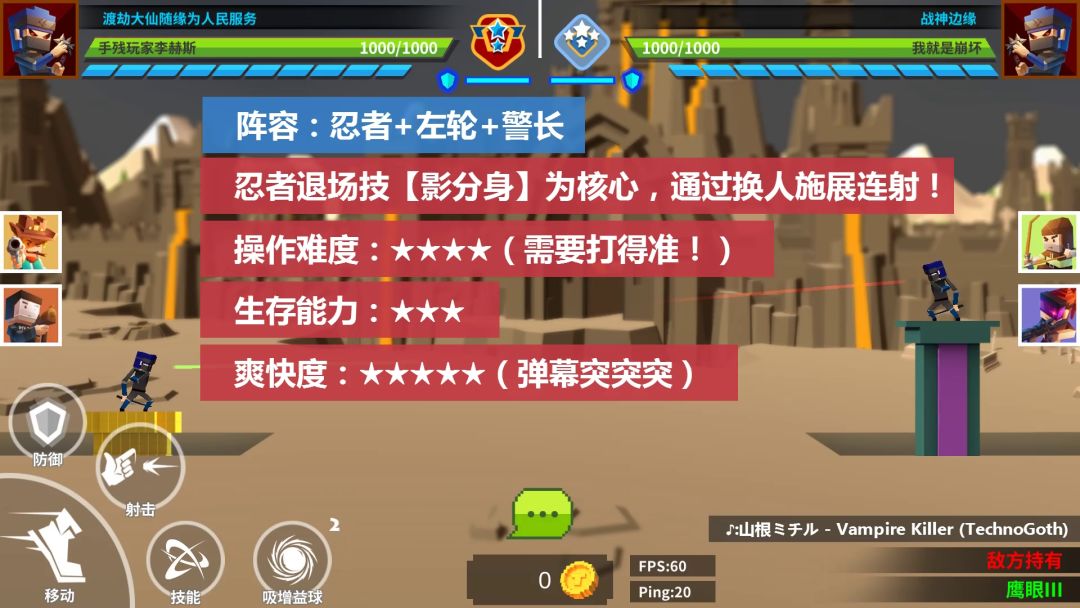 阵容搭配:忍者+左轮+警长 操作难度:★★★★(要打的准!) 生存能力:★★★(无回血加防角色) 爽快度:★★★★★(影分身配合子弹突突突) 忍者:技能反弹,退场技【影分身】加持队友输出制造双重子弹。 左轮:技能起手,连发爆头。(前提第一枪要瞄的准) 警长:技能疯狂输出,制造弹幕雨(右手瞄准按住屏幕不放,施展技能后可以调节子弹射击方向,另外移动柱子射击属于高阶操作,压枪也是属于高阶操作(通过观察对