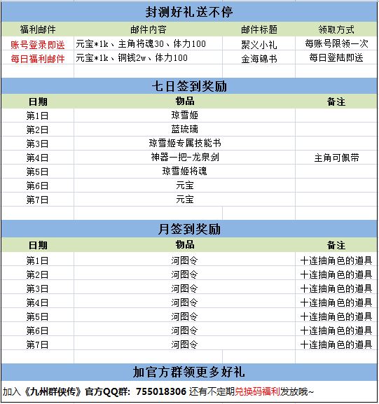 各位大侠:官方QQ群:755018306我们将于7月19日上午10点开启《九州群侠传》的第一次测试,测试时间为7天。此次测试主要是让大家体验一下核心玩法,我们会开放部分主线剧情和角色城市。希望大家测试期间能够提供更多建设性的建议,多一点暴露我们的问题所在。封测期间,我们每日送出如下好礼,望各位大侠多多参与,提建议!