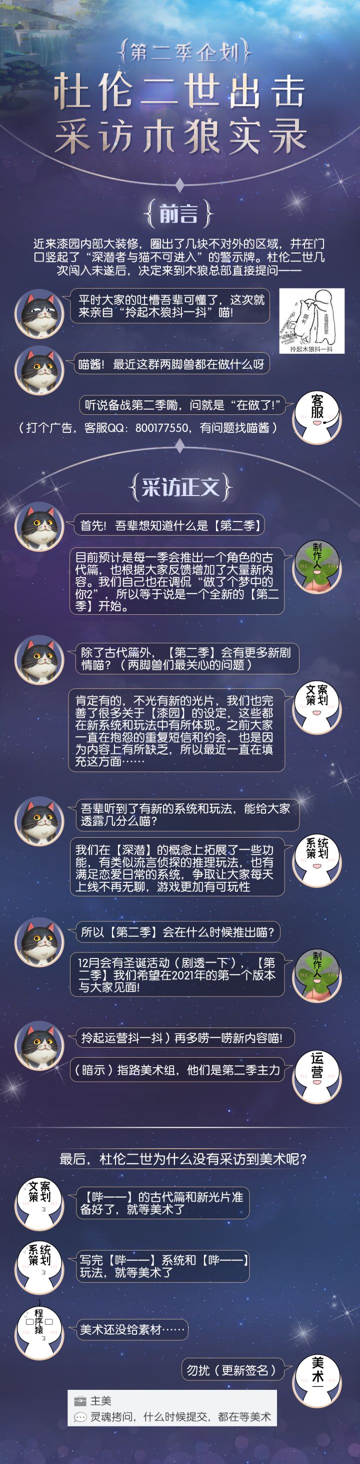 第二季?古代篇?杜伦二世出击,采访木狼实录!话不多说,内容戳长图↓↓↓PS:今天是漆园可被常规手段检测到的一百天,安娜和杜伦喵发来的消息大家收到了么?