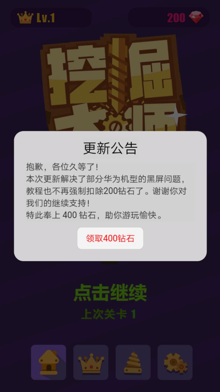 挖掘大师从6月24日上线至今,经历了一系列事件,包括黑屏,广告播放问题等等,现在依然每天有很多玩家在玩挖掘大师,非常感谢大家的支持!由于这个游戏属于个人作品,所以游戏的更新和规划一开始是很粗糙的,包括游戏细节并不完善,上线的这段时间,我收集了很多热心玩家的反馈,我准备积极总结分析,采纳大家的建议,重新规划和完善这个游戏,很快我会给大家带来一个全新的挖掘大师,一个纯粹的休闲好玩的游戏,感谢大家能继