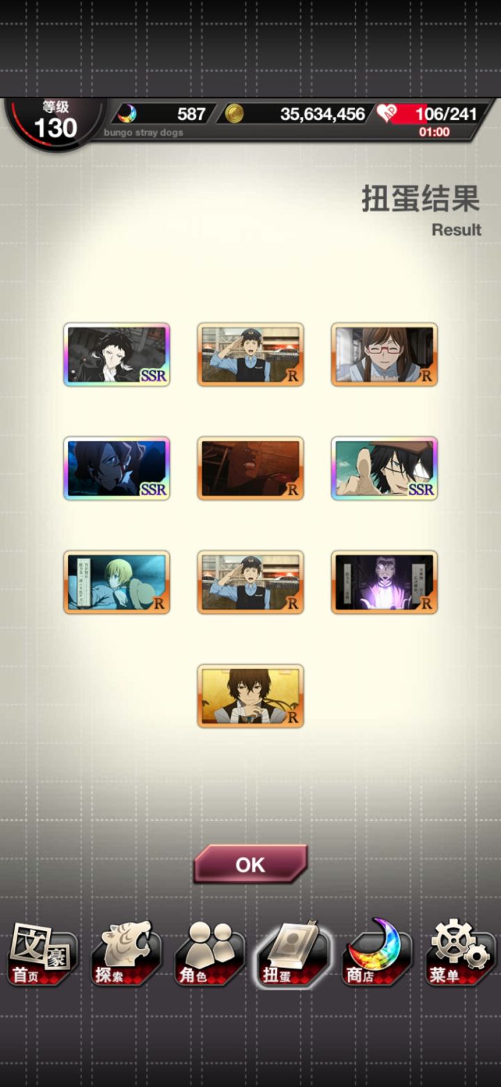 攒石的孩子没抽梅雨(乐队把所有石头全耗了),所以我去抽了场景,才不是因为太非所以不敢抽梅雨!然后。。。。。虽然全是重复,但是这个运气真的是我这个非酋能有的吗?随便ps:乱步先生你真的好爱我,本命诅咒也真的体现的淋漓尽致啊。(宰厨好难)