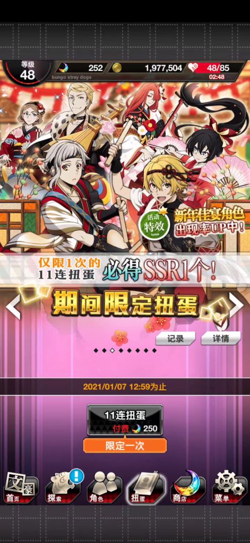 二周年活动预告高难试炼!「阿拉伯」&迷犬节系列主题,即将开启!活动一:期间限定&阶段上升扭蛋-阿拉伯~阿拉伯传说风的限定角色,将在期间限定扭蛋中登场!活动时间:8月26日16:00~9月9日12:59②阶段上升扭蛋:到达第三阶段必得SSR角色*1,到达第五阶段可获得SSR【阿拉伯】芥川龙之介、 SSR【阿拉伯】樋口一叶、SSR【阿拉伯】梶井基次郎其中一个,到达第六阶段SSR出现率高达1.
