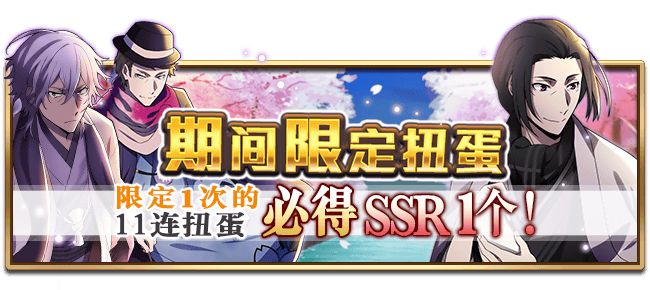 ①期间限定扭蛋:SSR【夜樱漫步】福泽谕吉、SSR【夜樱漫步】森鸥外(可解锁特别形象)、SSR【夜樱漫步】弗朗西斯·F且限定1次11连扭蛋必得SSR一个!