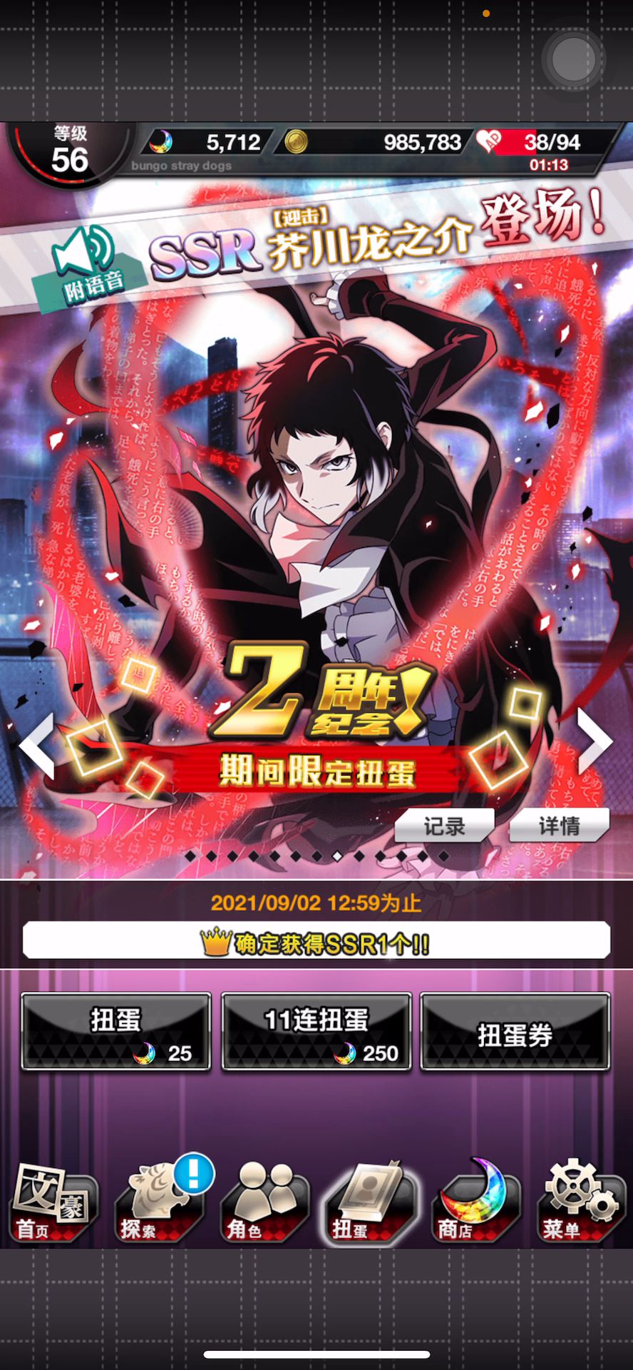 2020年三月入的坑,中间a了好久,断断续续的玩,到现在还没100级虽然我懒得练级,但强力卡还是有的七七八八(我是强力>厨)这个号场景卡非得不行,每次都重复,其他也没啥东西了到现在都没有完成我的主页全中也,主要是绿暗没有中也强力卡队伍配置,双壁卡真好,一下拉高了我苍队实力,我的光队全中也就差一个光属性百分比加成的中也了以及,这俩人的觉醒材料真的已经恰灰大半年了,我什么时候能拥有普卡啊?!