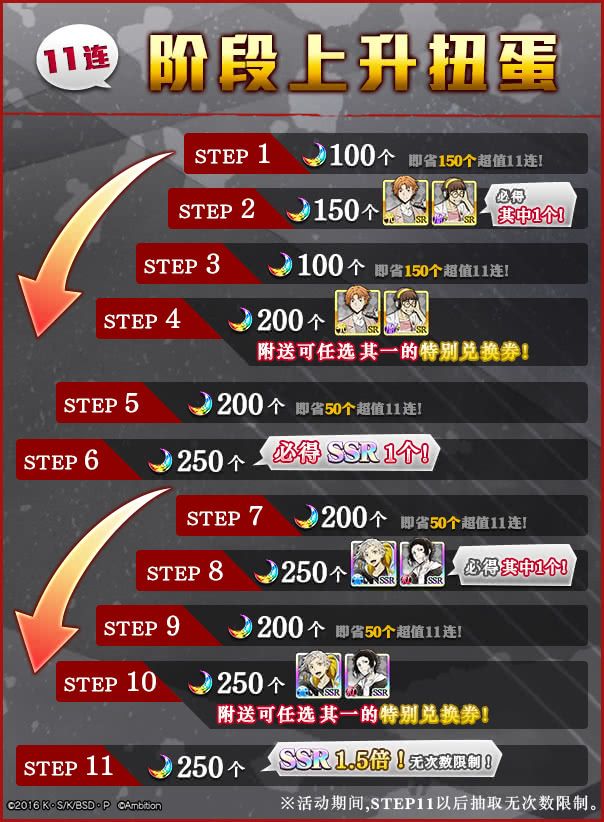 活动一:期间限定&阶段上升扭蛋:【假日】中岛敦、【假日】芥川龙之介、【假日】谷崎润一郎、【假日】梶井基次郎活动时间:3月26日13:00~4月5日12:59(11天)活动内容:身穿假日休闲服装的中岛敦、芥川龙之介、谷崎润一郎和梶井基次郎,限定扭蛋登场!本次阶段上升扭蛋STEP2时必得限定SR【假日】谷崎润一郎、SR【假日】梶井基次郎其中之一,STEP4时附送特别兑换劵(*使用特别兑换劵