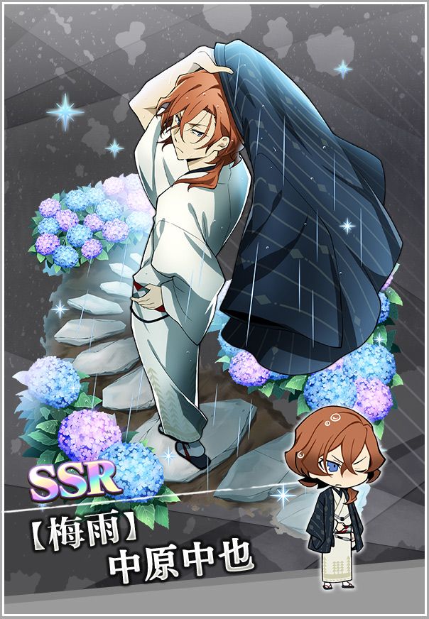 佳节连梅雨,中秋明月圆!提前祝大家中秋快乐!活动一:期间限定&阶段上升扭蛋【梅雨】活动时间:9月12日13:00~9月19日12:59活动内容:本次活动有机会获得以下限定角色SSR【梅雨】中原中也SSR【梅雨】森鸥外活动二:掉落活动【细雨走过的漫步路】活动时间:9月12日13:00~9月19日12:59活动内容:期间限定的掉落活动,参与活动关卡,有机会获得特别的限定角色!限定角色