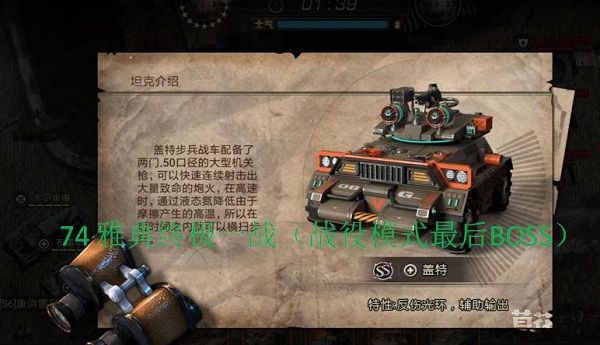 雅典终极一战(战役模式最后BOSS)84级开启74城雅典74城战役中以往的攻城利器ZBL-09战车在战役73城伊兹密尔时开始已经明显被设定为首选被打击目标,以往的常规阵型不能再保证73以后的战役通关。现在简要介绍下74最后BOSS战,通关阵型,希望能在你的战车培养上提供些建议。通关阵型采用:1防,3辅助,1支援1防可以选择带有静默技能的防御车辆,推荐挑战者或者梅卡瓦,个人推荐挑战者挑战