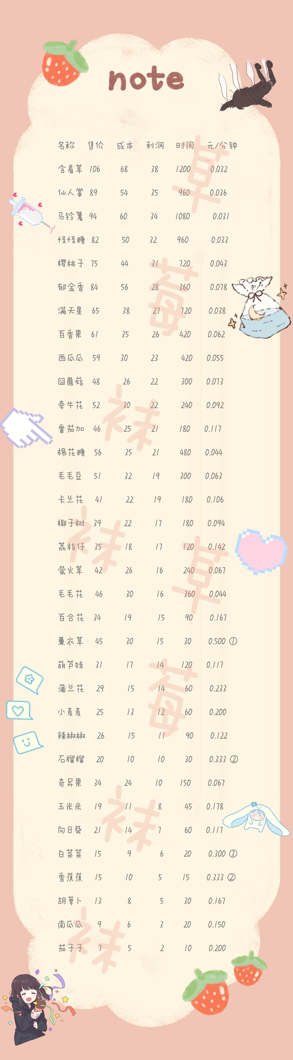说明: 不包含活动植株 排序按照利润由大到小(图一、图二) 后面的序号是元/分钟大到小排名 为了排版好看些,名称统一三个字 图一为花里胡哨版 图二为极简主义版 图三按照店铺的顺序来排序(不知是否会因特产导致店铺顺序不同) 计算公式: 售价-成本=利润 利润÷时间=元/分钟 (统一四舍五入到0.001) 建议: 其实看“元/分钟”没用,因为你不可能掐点去种菜收菜,而且它还有限制购买和氪金植株,所以如