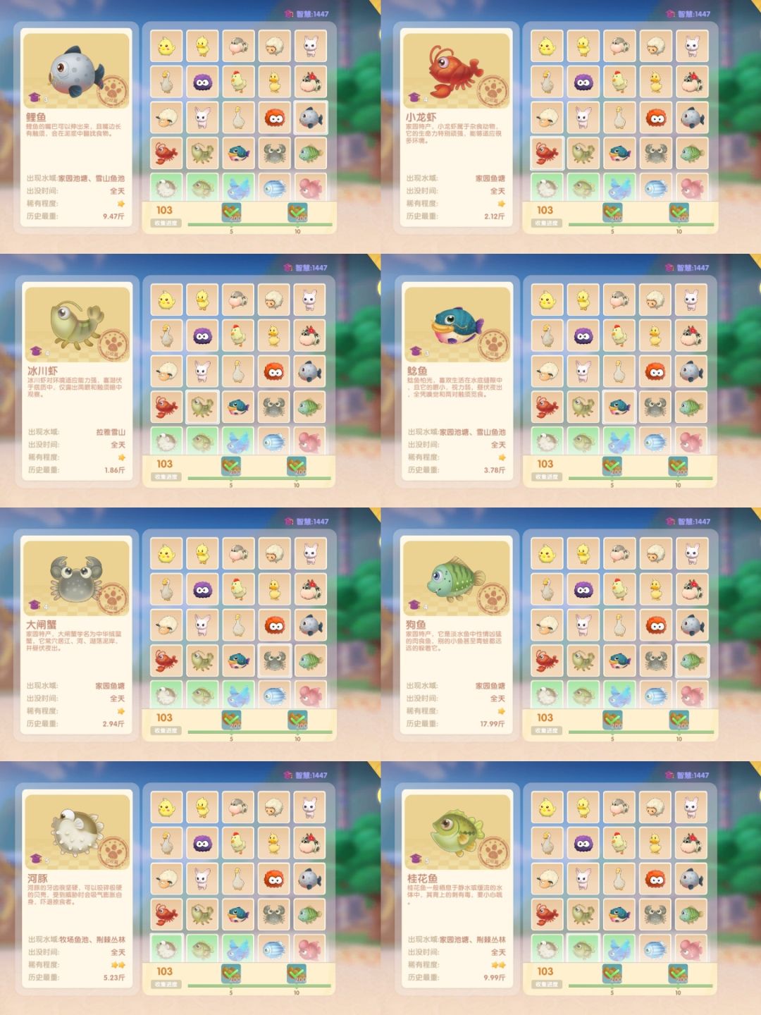钓鱼宝典:分四个场景 🌟神秘湖 粑粑海肠、花瓣海胆、金枪鱼、樱花蛇、沙丁鱼、鲳鱼、初恋海星、带鱼、海豚、月亮海螺、怪怪鱼、琵琶鱼、星空鱼、玫瑰海星 🌟家园鱼塘 桂花鱼、狗鱼、大闸蟹、甲鱼、锦鲤、小龙虾、硬翅桂花鱼、鸭嘴怪怪 🌟雪山鱼池 胖头鱼、绿鲤鱼、抱抱熊、雪鱼、鲶鱼、利齿狗鱼、肥头鹅、鳌虾、红鳞鱼、鲤鱼、眉毛鱼、美美鱼、紫色鲶鱼、许愿龟 🌟浆果丛林 斑马鱼、变异斑马鱼、花罗汉鱼、枫叶鱼、芭蕾鱼