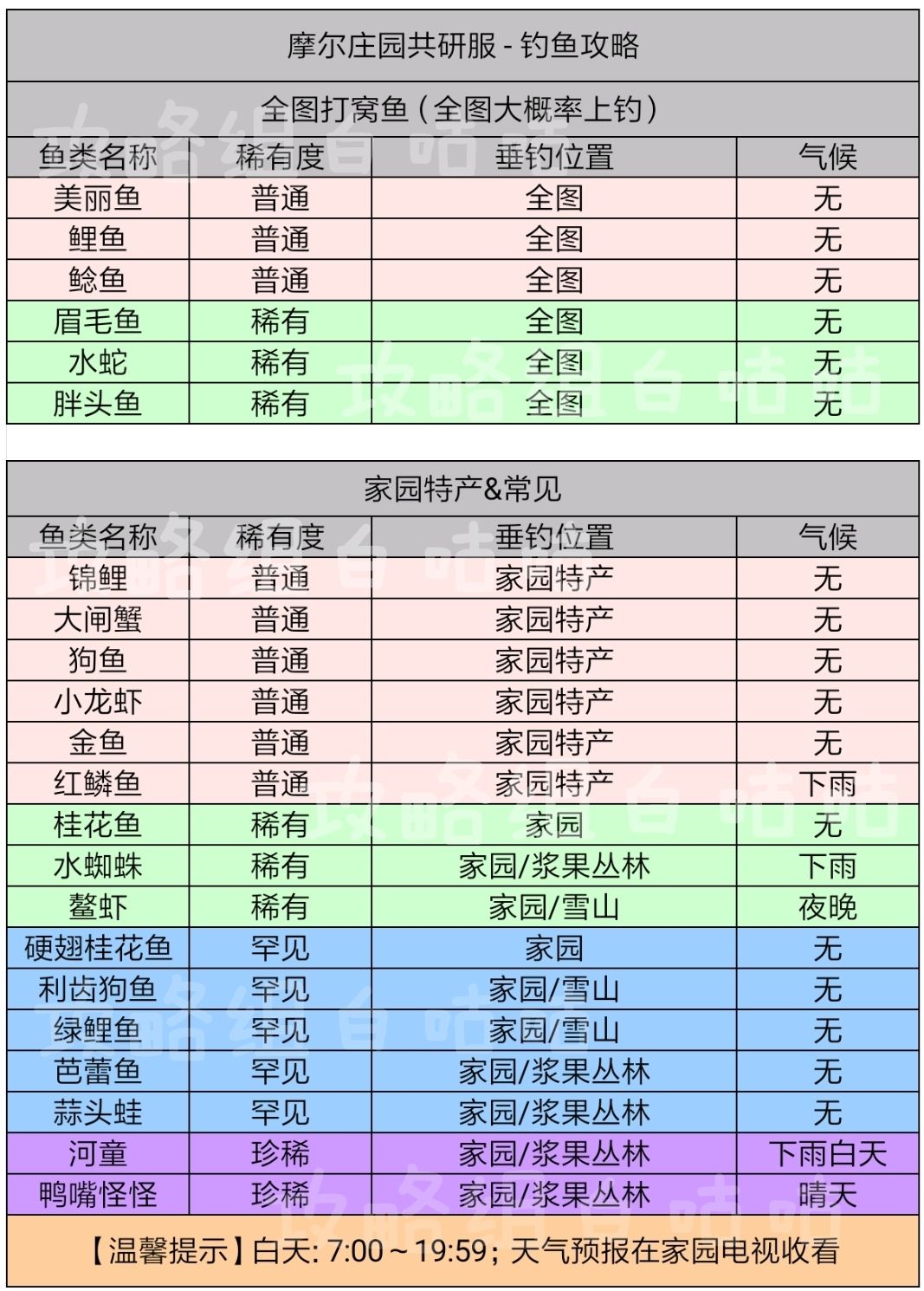 🔴码住,码住! ☞以下为此次公测各类🐟的稀有程度、地点及时间 ☞请小摩尔们以图片为准! 解读:攻略图共分为7种垂钓地点分组,每组地点列出各种鱼种的稀有程度和时间天气要求,注意有些鱼种会存在多地钓到的情况。鱼种等级分为普通,稀有,罕见,珍稀,传说五种等级,垂钓难度依次增加。 例如:在神秘湖,粑粑海肠为普通等级,易钓,全天可钓。 在家园或浆果丛林,鸭嘴怪怪为珍稀等级,不易钓,需在晴天才可钓到。 ❗️P