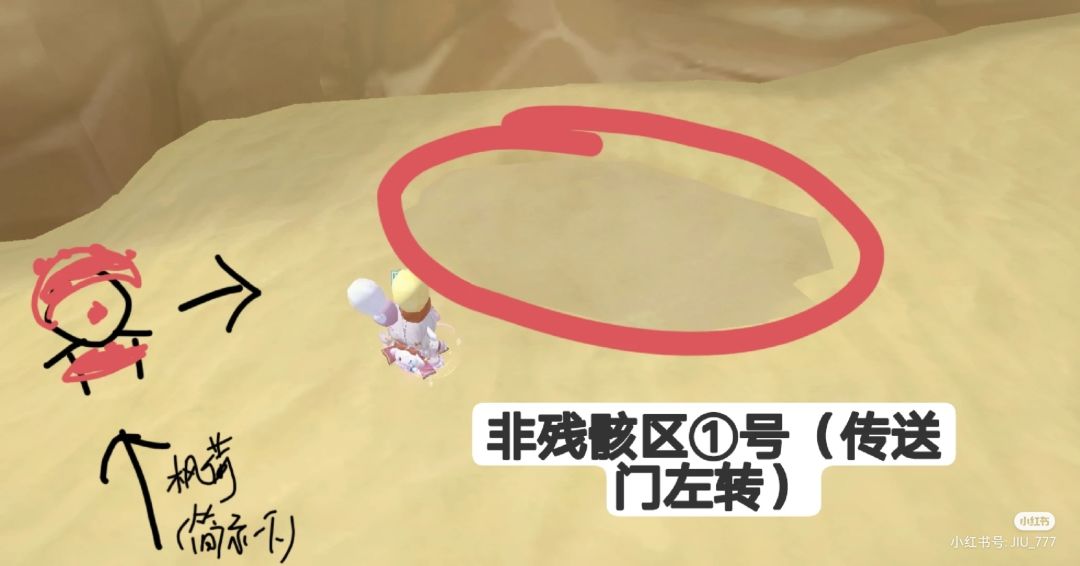 ❗首先我们要清楚每个区每个服的沙漠都有6个沙坑,分别是3个残骸坑3个非残骸坑。 ❗其次我们要知道每个区每个服的沙漠每天只开放一个沙坑(可能是残骸坑,也可能是非残骸坑,需要摩摩去换服跑图找想要的沙坑)。开放的沙坑周围是沙子环绕的样子,不开放就如图所示是沙坑阴影,不能沙钓~ ❗目前非残骸坑的位置分别在沙漠传送门的左右两边的两个沙坑以及沙漠最里面临海钓台的沙坑,可以白天垂钓常驻传说鱼七彩水母! 而