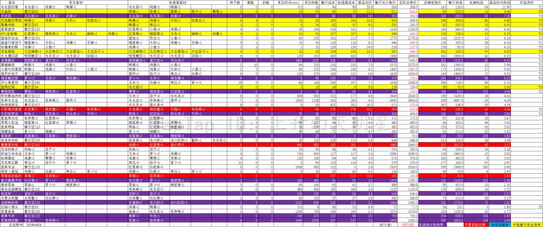 欢迎交流(表格食用时长数据没测完,尚不完整,欢迎补充) 数据比较多,没耐心可以直接看标红的两栏:【餐厅窗口-利润/份/min】,和【私房菜-单个种子创造利润】 客人吃饭加速后时间计算公式:实际时长=基础时长*(1-(桌子加速+炉灶加速)) 附:苹果特产私房菜日入万豆种子购买指南 2021.7.7重制了一份,加入了梅森的种子成本,和制作优先级别;苹果特产玩家私房菜日入万豆种子购买。 2021.7.8