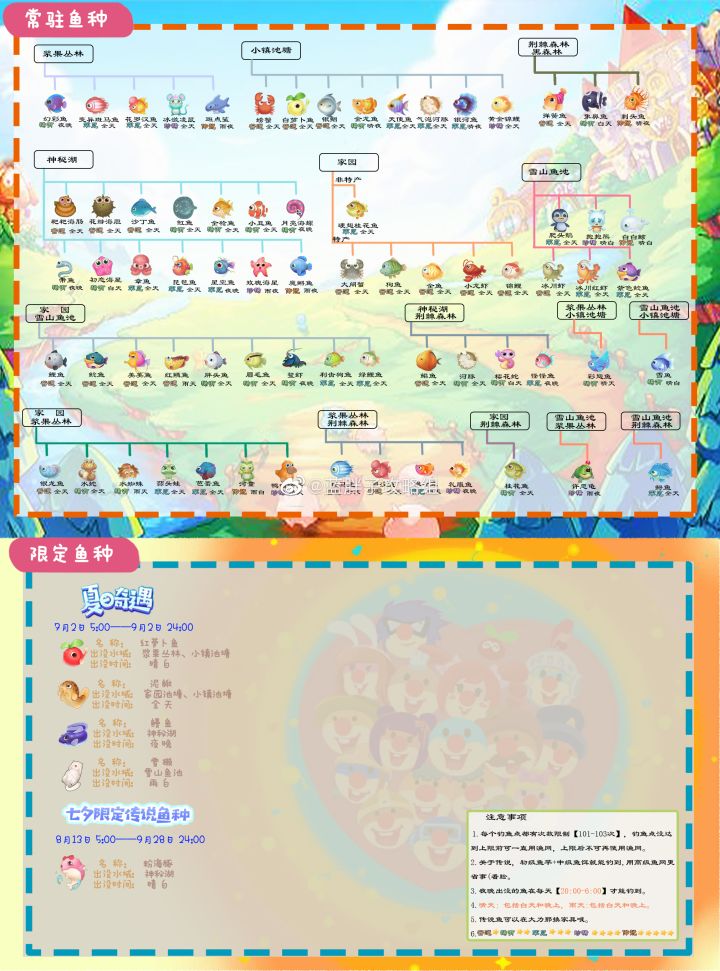 📢白天:早上6:00-晚上20:00夜晚:晚上20:00-早上6:00【注意:早上5:00-6:00属于夜晚,可钓夜晚鱼种】 📢晴白鱼种🐟:晴白雪山白白鲸【常驻鱼种】白天沙漠无残骸七彩水母【常驻鱼种】💜晴白迷雾沼泽太极鱼【限时返场】💛晴白冰域柠檬鲨【限时返场】💗晴白沙滩粉海豚【5.29更新后返场】📢雨白鱼种🐟:雨白雪山雪獭【常驻鱼种】雨白家园、浆果丛林河童【常驻鱼种】雨白