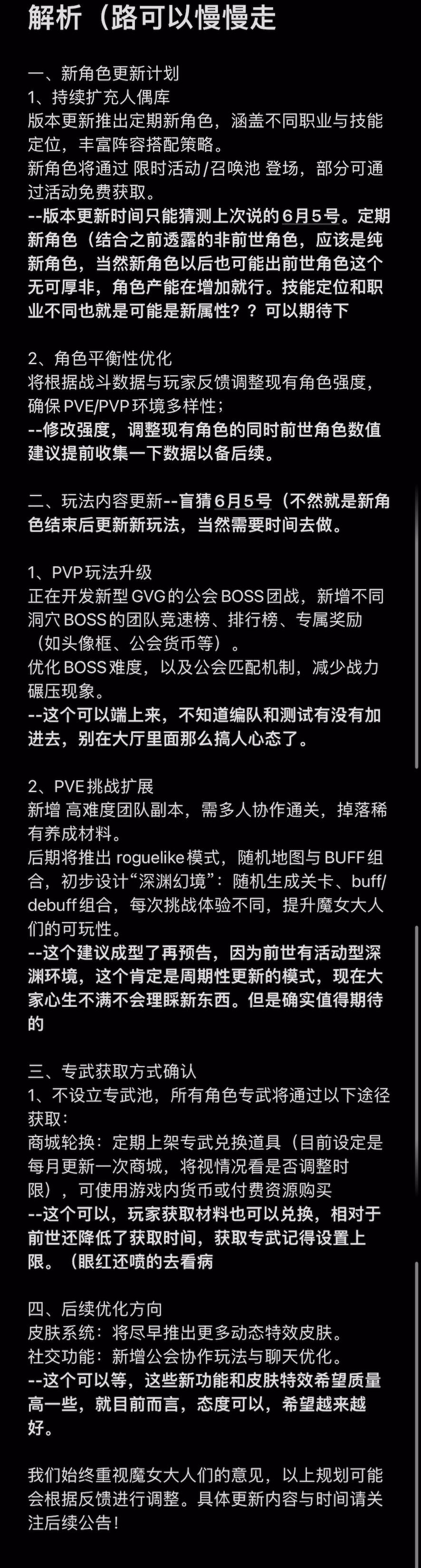萌新(划重点)卡池抽取及阵容搭配建议(8月19日) ----已修订 新来的魔女可以直接抽个萌新队(暗奶森女凯瑟琳),开局自动到结尾。口说无凭,用图佐证。图一图二是自抽号9个小时从第一章推完第四章的图,等级看图,技能都是221,装备都是30级紫装,默认自动挂机不卡图;图三图四是过第四章间幕和第五章的图 ,技能552,装备全词条彩装,附魔词条拉胯。第四章和第四章间幕之间难度相差比较大,等级、彩装、技能都要慢慢拉,推完第四章后就基本日常养老了。 一、卡池抽取 1.初始十连建议:只要觉醒或活动卡池不是恢复型人偶都建议抽暗奶--托奈兰(暗奶泛用性高,这个游戏可用的输出和坦克有好些,但是目前啥阵容里都好用的奶妈就这一个,有了暗奶搭配起阵容就很容易了);初始十连最好附带有森女 ,其次蛇女。 2.UP池只建议抽凯瑟琳,面具, 枕头和龙女(如果有的话);灵魂有富余的话可以抽脱解、海豚、天马这几个(我觉得没必要);其他人偶等歪就好了。 二、阵容搭配 1.萌新向:森女暗奶凯瑟琳(无脑拉满即可,森女破防打BOSS很好用,暗奶适配目前各种队伍,凯瑟琳至少在前五章都好用----更详细一点点的人偶分析见楼下回复) 2.盐石队:面具暗奶龙女(龙女--战令或等歪;没龙女,可用由依--竞技场可换)----强,建议练 3.水银队:海豚(或森女、蛇女)脱解枕头(或南奈尔),开服热门,现在有些失宠 4.硫火队:目前除了1300,没有好的输出手;估摸氪***夏尔凯瑟琳 5.混搭队:暗奶+凯瑟琳+任意输出手(推荐:平民森女 ,氪金1300)、暗奶+面具+任意输出手(推荐森女,1300;buff多伤害高但没有前排,只能打没啥输出的boss)、其他略了 如有不足 ,欢迎指正。