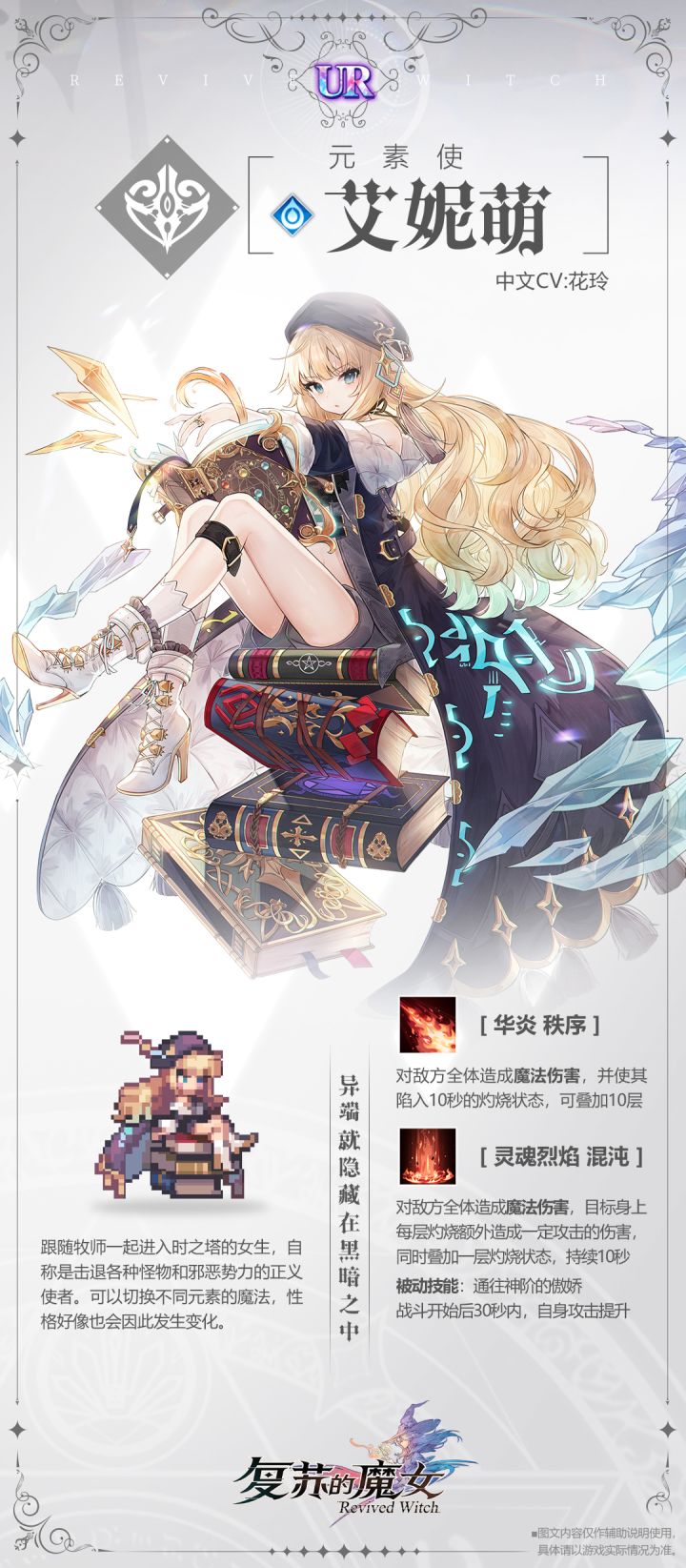 亲爱的各位魔女大人:非常感谢大家一直以来给予《复苏的魔女》的支持与厚爱,我们很荣幸能与各位魔女大人携手走过两载春秋,在这两年里我们一起踏进神秘的时之塔,从静谧美丽的伊敏瑟伦到白雪皑皑的谢波契卡,再到立于云端的嘉庇艾尔,用记忆碎片拼接出属于我们共同的回忆。也曾期许过与大家岁岁相伴,但是很遗憾,由于现实种种不可抗力,项目组难以继续支撑下去了。今日,我们在此宣布:《复苏的魔女》要正式跟大家道别了,