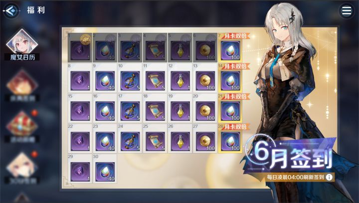 此外,每月7日/14日/21日和28日为月卡双倍日,购买了月卡的魔女大人在这些日子签到可获得双倍奖励哦~若签到时未购买月卡,在本月购买月卡时会补发当月的双倍奖励哒!
