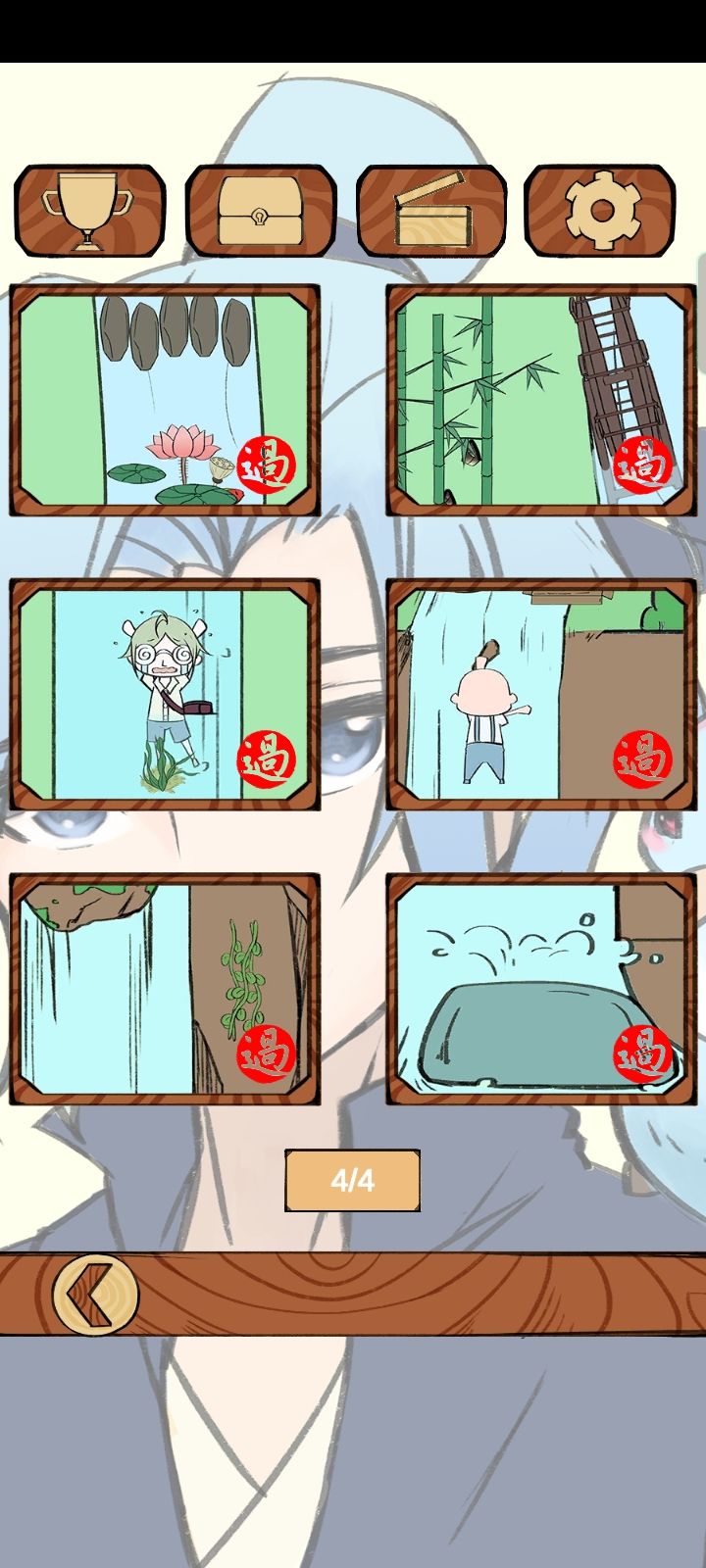 1.拿塞子塞水管⭐2.拿瓦片撬锁⭐3.点墙获得四块砖块,用三块好砖垫脚拿下火柴,把蜡烛放正用火柴引燃。——用大石块砸锁⭐/拿坏砖垫脚⭐4.取火把点香,取香灰灭火,解下侧边绳,以绳结天梁,取佛首,系悬绳。——移开坐垫触发机关⭐/不灭火取下绳子⭐5.用三片瓦片砸在台阶前拿起蘑菇,网上的树叶,鸟羽,按照要求形状摆在窗下,拿三根绳子组成网,把网拖到树上,解开绳索⭐6.去右边点左边的藤条,拿金