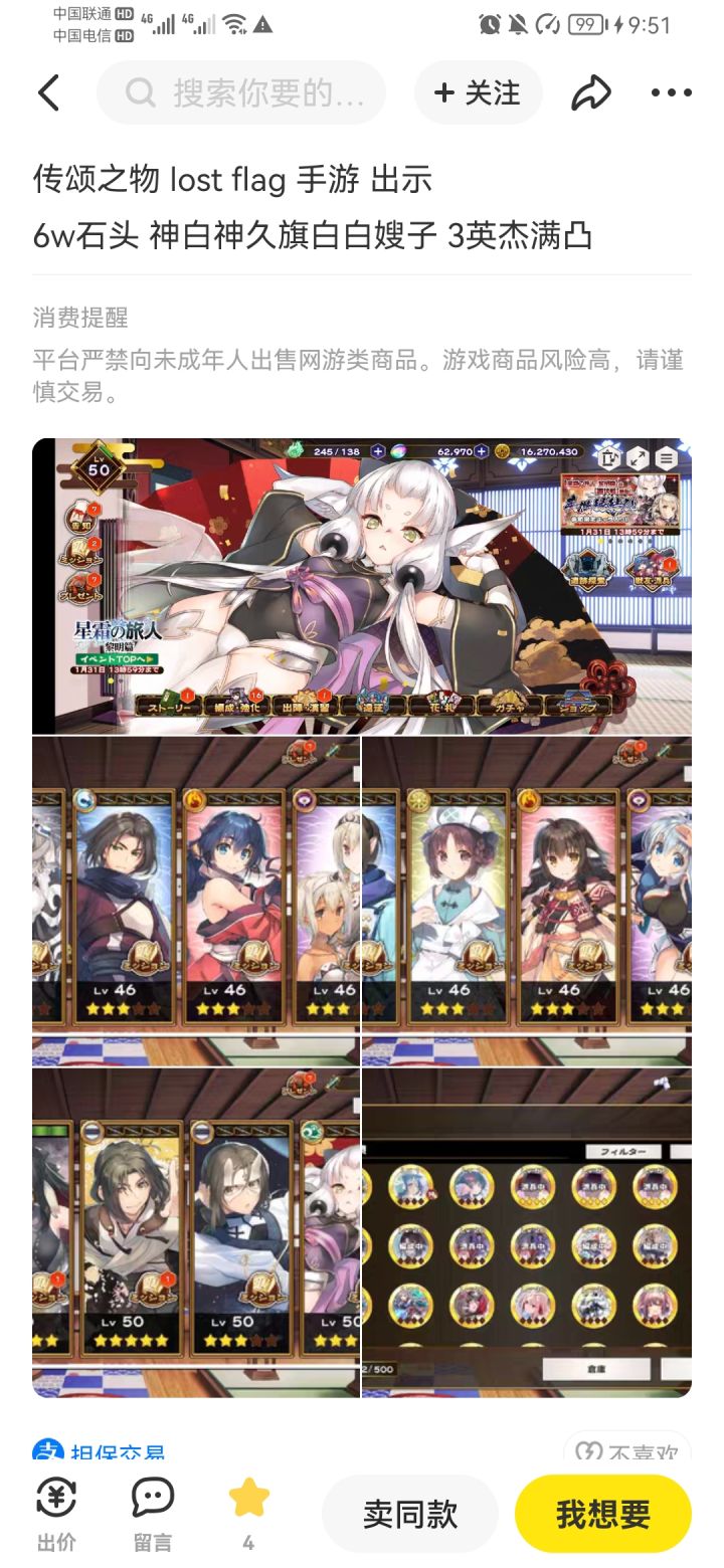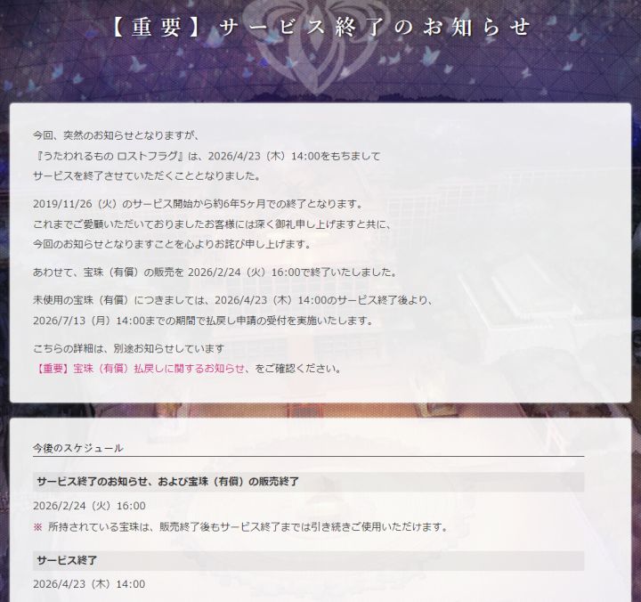 太突然了家人们!2019年11月26日AQUAPLUS推出《传颂之物》系列IP的手游《うたわれるもの ロストフラグ》(翻译为《传颂之物 Lost Flag》)最近突然发公告,宣布将在今年4月23日正式停止运营这游戏从2019年11月上线到现在,磕磕绊绊也撑了整整6年多,算是手游里挺能打的了,没想到这么一个陪伴玩家多年的老东西今天和大家说再见了消息一出,不少老玩家都挺唏嘘的,毕竟传颂之物这个IP