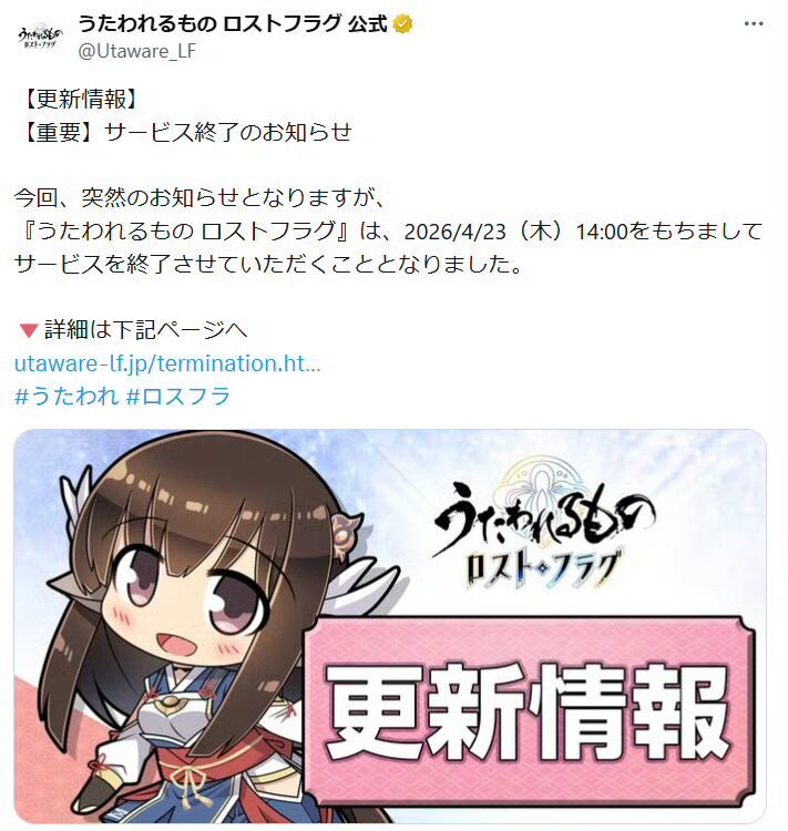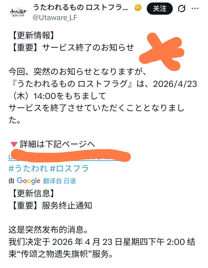 今天,AQUAPLUS官方正式宣布,旗下手游《传颂之物LOST FLAG》将于2026年4月23日关闭服务器,终止全部运营服务。 《传颂之物LOST FLAG》于2019年11月26日正式上线运营,到停服时累计运营时长约6年5个月。本作是《传颂之物》IP推出的正版手游,完整继承系列世界观与剧情风格,收录大量系列经典角色,主打回合制战棋策略战斗与角色养成玩法,为系列粉丝提供了沉浸式的IP体验。#今天游戏圈发生了啥