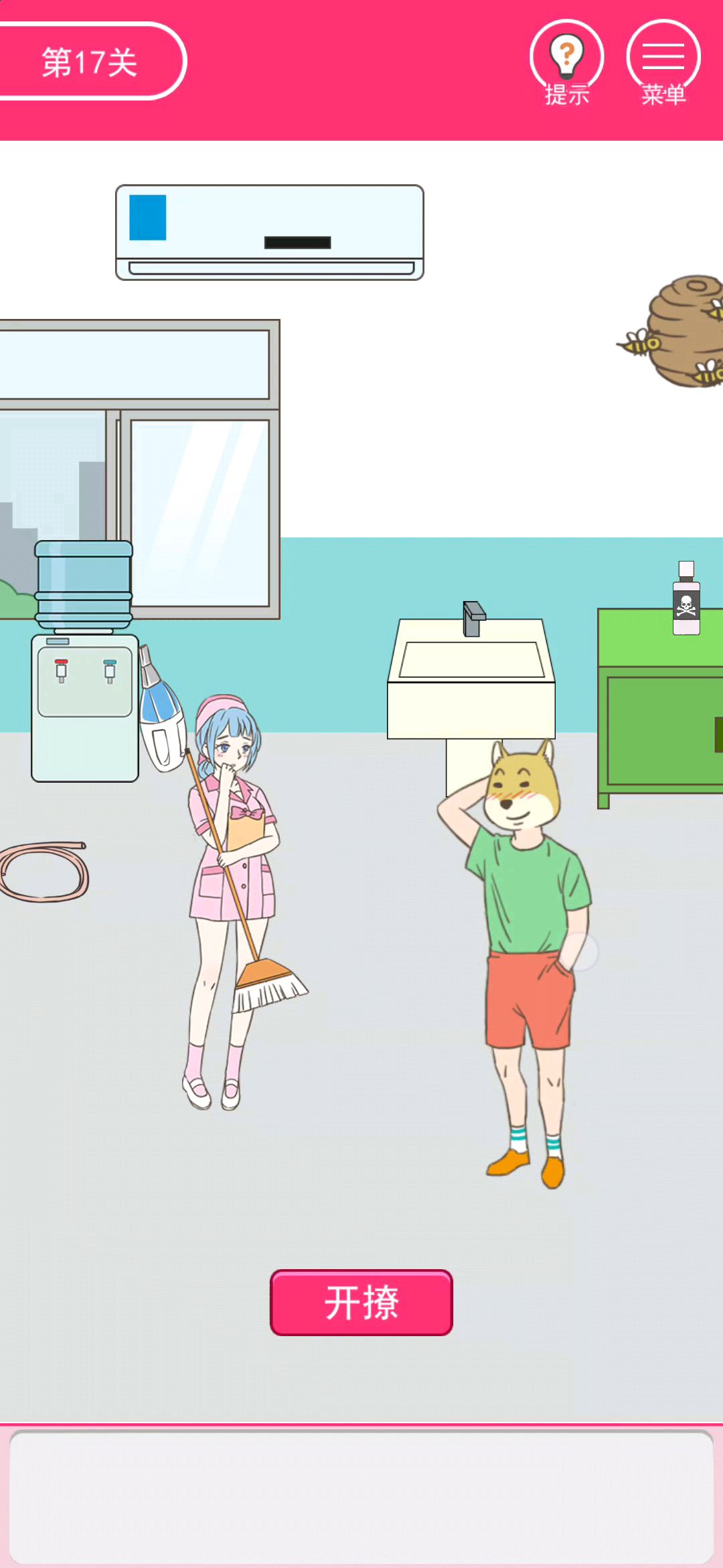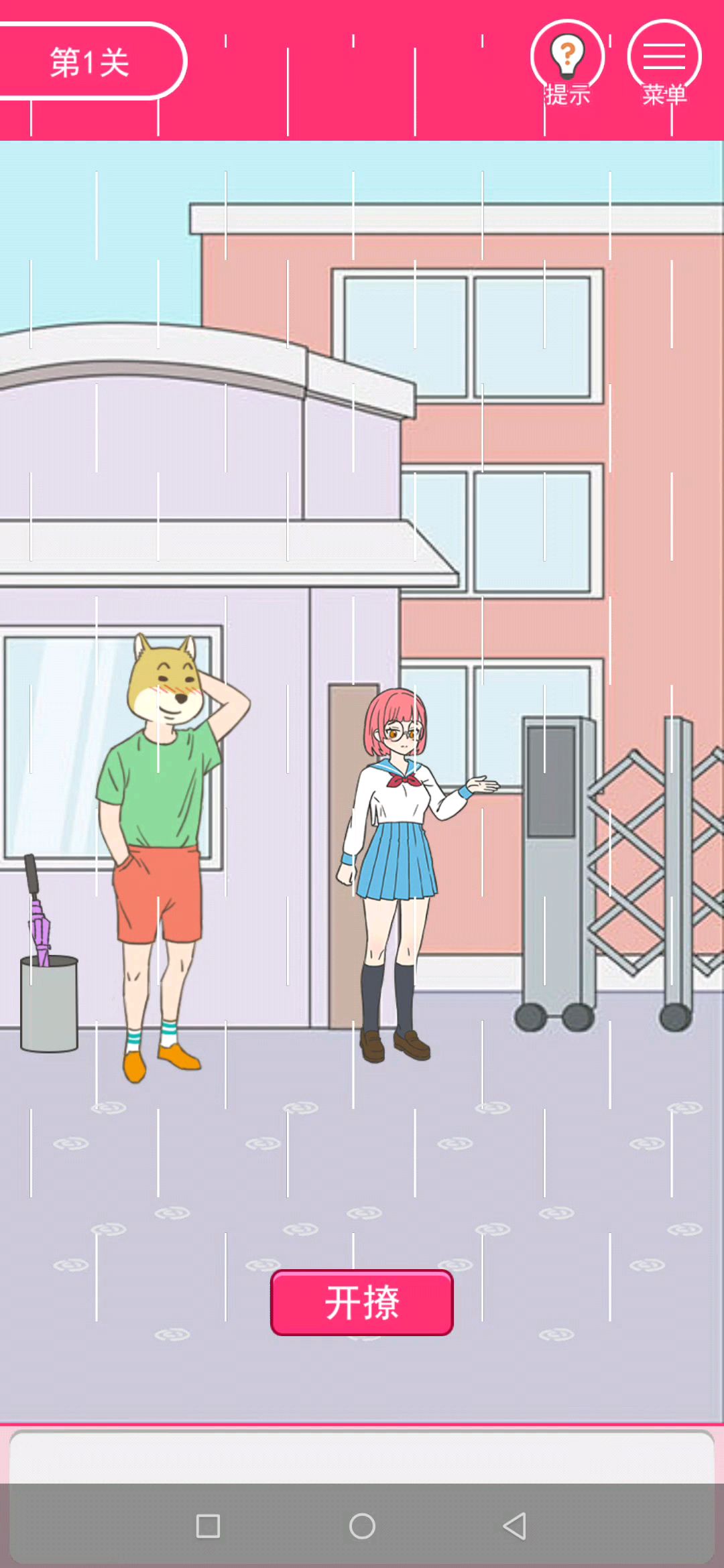 1.点紫色伞给狗子2.换场景点垃圾桶点抹布用抹布擦扶手3.黑板上么么哒右边花下第一个爱心,上边第二个爱心,拿粉笔用粉笔给空白爱心图案得到第三个爱心,全给狗子4.换场景点气锤给狗子开始打地鼠成功五次给一颗硬币,地鼠机下面有一颗硬币全部投进抓娃娃机5.点狗子会掉下一块布,点第三棵树右边的树枝可以得到树枝,用树枝点鸟得到第二块布,将两块布放在凳子上6.点树点王子再点右边的红布两次,苹果变成毒苹