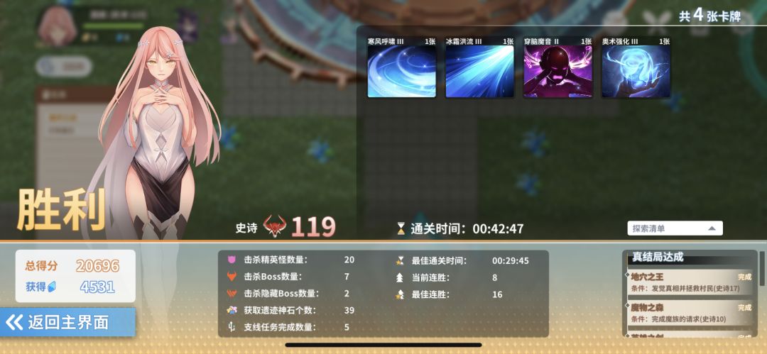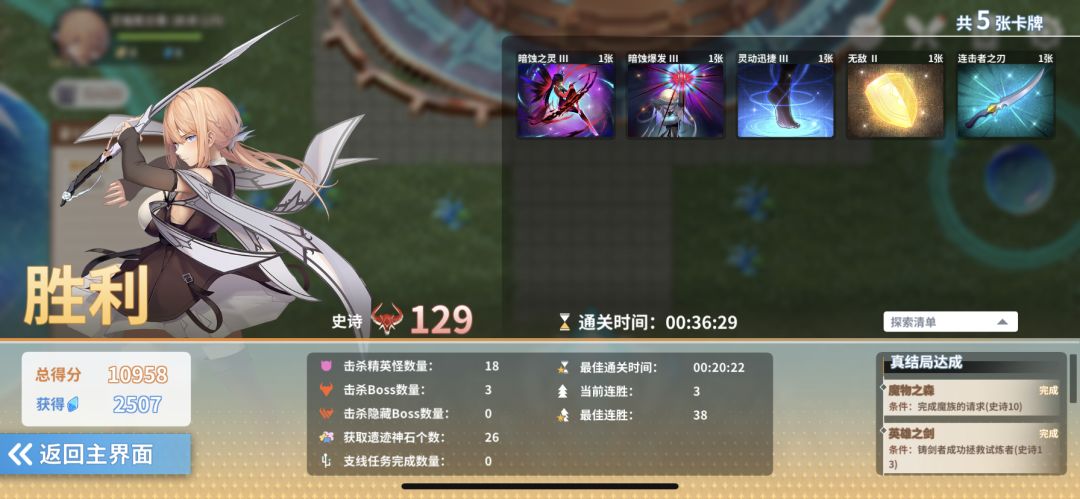 借口:因为是测试,所以尽量要用少的卡牌打,所以高史诗掉落和可以获取的很多卡片我都没拿,不然战力提升的情况下要秒boss就更简单了。这里主要是通过思路提供可行的通关思路而不是速刷。 而且支线都没碰,只打了最少的boss和小怪来获取神石,所以整体强度非常低,但是通过自组捡牌加强后应该是能通过魔战二三的