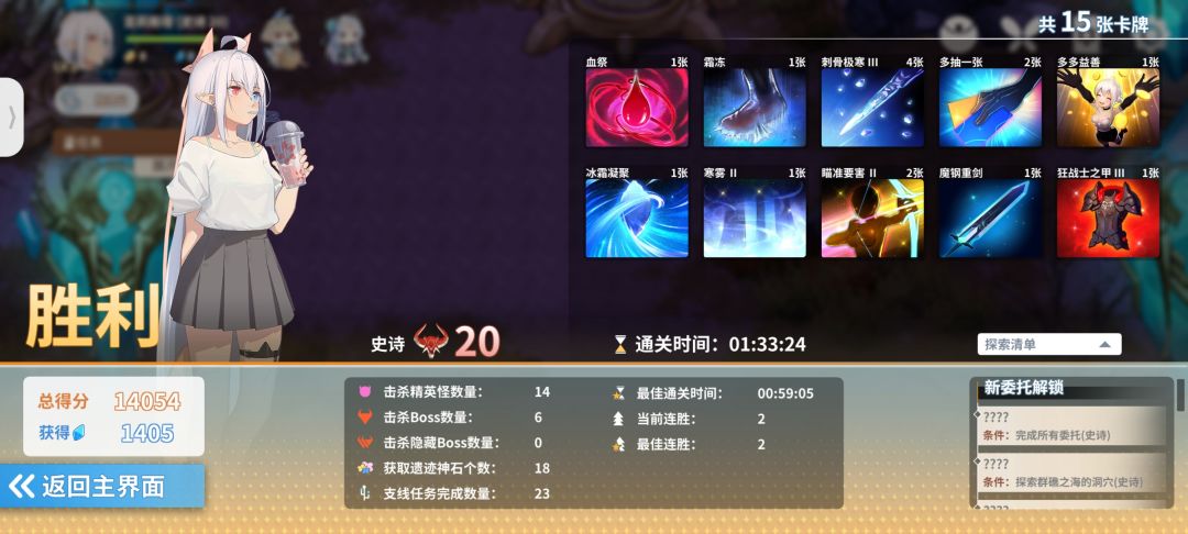 下图有渲染的50%加成,小游戏大概玩了30把 难度不选boss精英多血条,其它全选,前两次委托只做能触发隐藏boss的必要支线+清精英,如果有混乱之潭打完精英直接速通,第三次委托选好跑图,精英怪多的,隐藏boss好触发的,比如魔物之森,沙滩之类的。 仓库: 连击者之刃(降临) 永冻终焉(回收 节能) 冰霜洪流(任意,不附魔也行) 贤者的睿智(节能),非必要,不过还是带张比较好 奥术强化/元素强化,