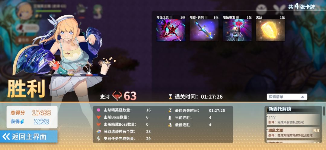 1,关于很多玩家问的史诗怎么增加 在选角界面有个史诗选择,点进去后自己选择难度。 2,关于难度上限增加计算 在结算界面,大家可以看到分数,分数的影响由下面这些完成的内容量确定。分数大于等于4000并且小于7000,增加4难度上限,大于6000并且小于9000增加7难度上限,大于等于9000增加10难度上限。 3,关于虚空仓库 虚空仓库可以每局游戏把牌放进去,然后下一次游戏(包括换个角色)一样可以取