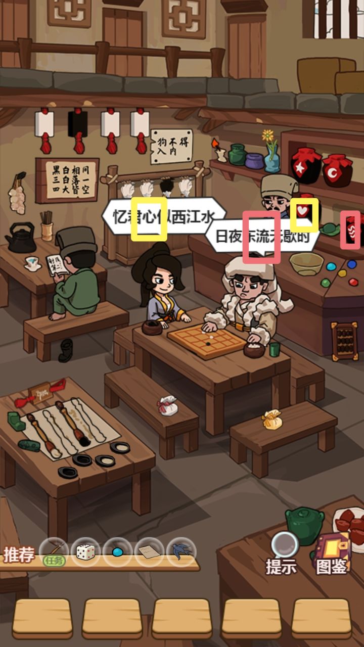 1.上菜根据老板说的话,将对应数目的丸子放入碗中,最后放艾糍。若要收集丸子或艾糍,则需先将碗收下,再点丸子或艾糍。2.对诗郭靖、黄蓉念的诗与酒坛上的花纹对应。例如:3.下棋书生书生说话的数字与颜色对应棋盘上的棋子与棋子颜色。告示告示上的三句话对应棋盘上的三行。 这个对应的棋子唯一且固定。雕、弹弓、木板雕、弹弓、木板对应棋盘上的三行。 例如: 牌子、毛笔、砚台牌子、毛