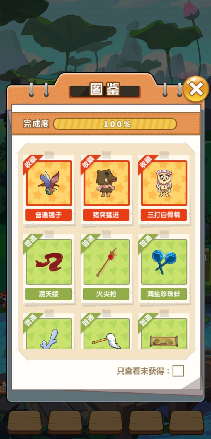 惯例,完成图镇楼新图真的超简单,攻略我就不写的很详细了。能玩到这个图的大佬们,估计也都找到一些游戏规律了。图鉴里面的道具排列顺序都是各个玩法集中在一起。所以,注意观察图鉴里的道具顺序。先说套圈,哪吒每局只有三个圈,怎么能最大化呢。开局先看有没有猪,优先套*猪。其次套骷*髅。最后套财*神。这个就是纯肝。因为骷*髅抽奖玩法的道具都是随机,耗损比较大。这里说一下,中间位置有一片叶子,点开,下面是鱼,乾