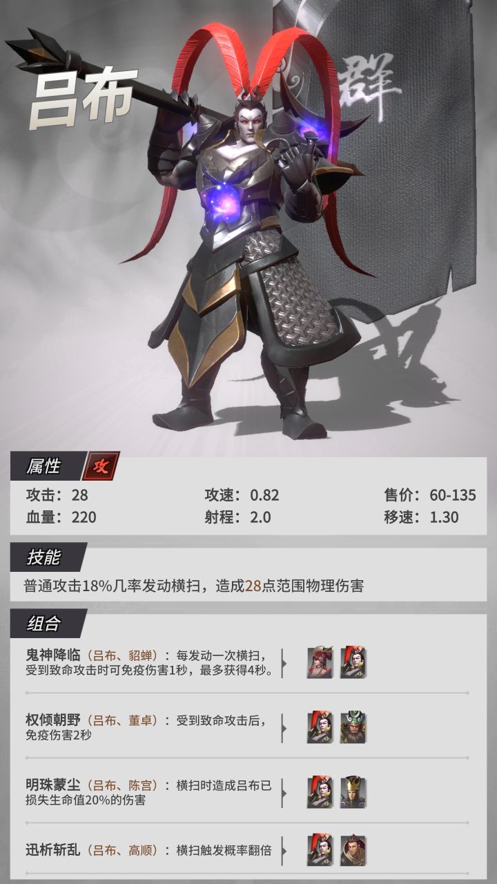 飞将军吕布,乃三国时代武力巅峰的代表。方天画戟、赤兔马等标志性武器、坐骑,更是为人乐道。《战三国 八阵奇谋》里,吕布同样有着冠绝游戏的超强实力。围绕他的“横扫”技能,更是能开发出以一当百的全新套路!【横扫千军,吕布实力强绝】《战三国 八阵奇谋》里的吕布,有着非常高的初始攻击力,一如他冠绝三国的武力值一般。他的技能更是被动触发横扫效果,对范围内的敌人造成伤害。然而他的初始血量并不高,移动速度、攻