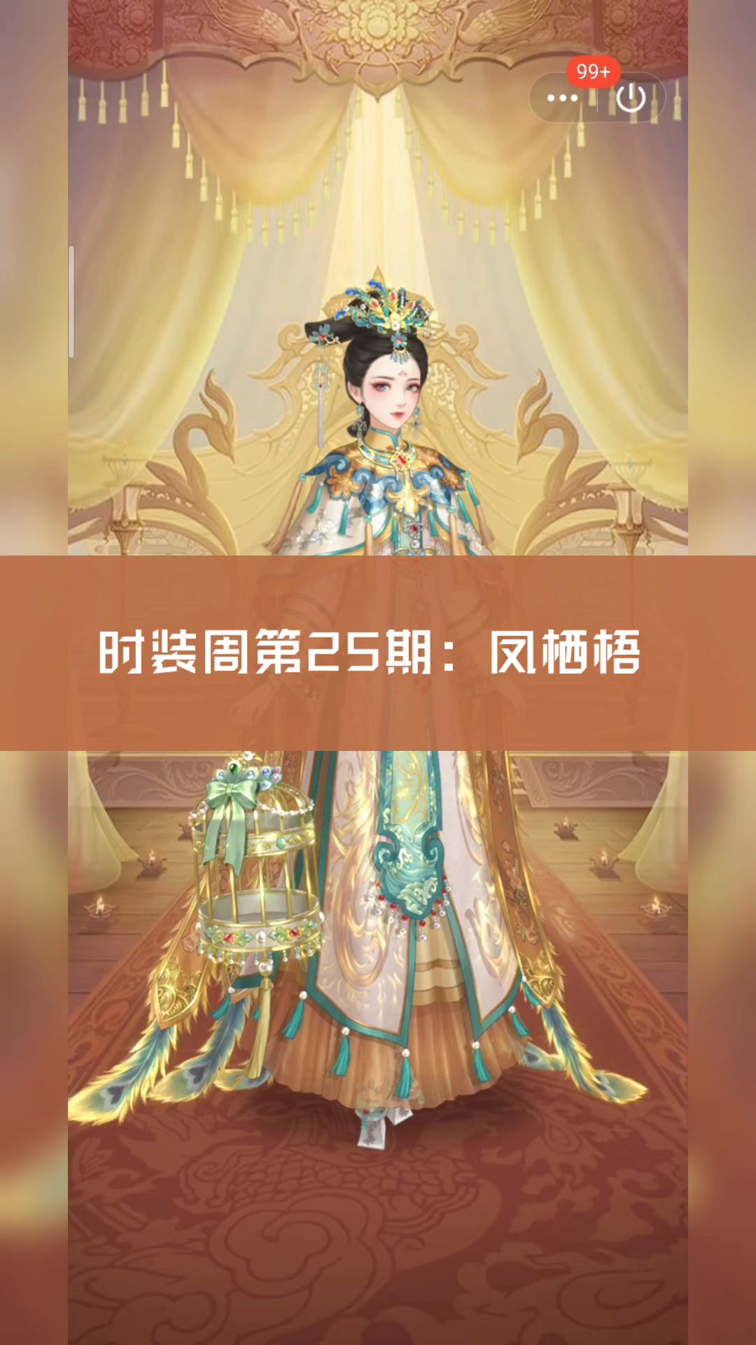 第25期时装周,初赛:凤栖梧,复赛:金羽披凤 推荐套装:【凤歌鸾舞】【碧纱宫羽】 推荐属性:华丽、端庄