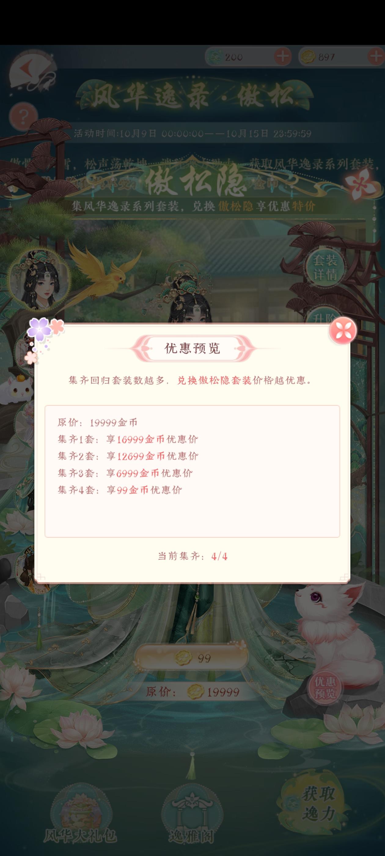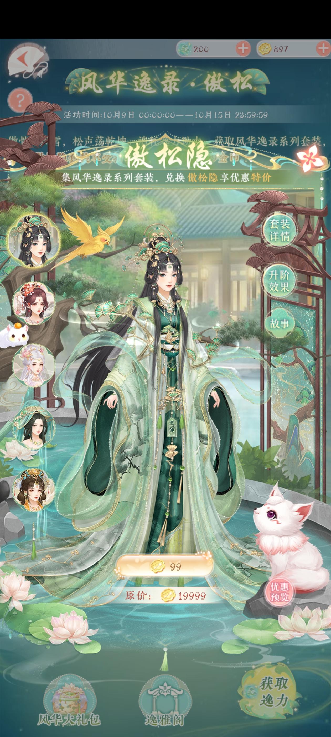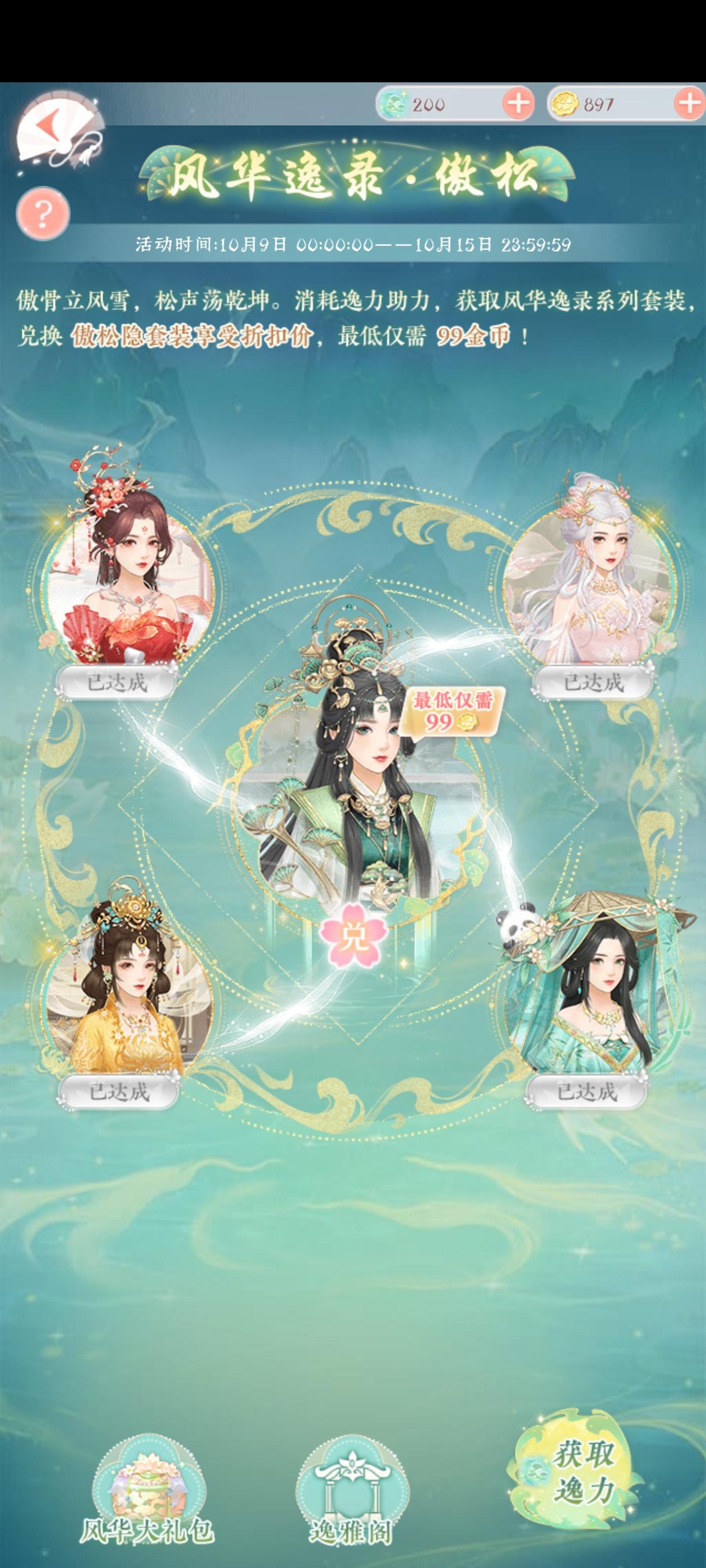 一、 风华逸录「傲松」傲骨立风雪,松声荡乾坤。 傲松隐携风华逸录系列套装呈献!活动时间:10-09 00:00:00 至 10-15 23:59:59领奖时间:10-16 00:00:00 至 10-16 23:59:59※ 活动期间,小主可通过消耗金币或完成累充任务获取逸力,使用逸力助力可获取风华逸录系列回归套装(沁梅君、玉兰主、苍竹卿、雅菊客)各部件。小主也可消耗逸力在逸雅阁兑换风华逸