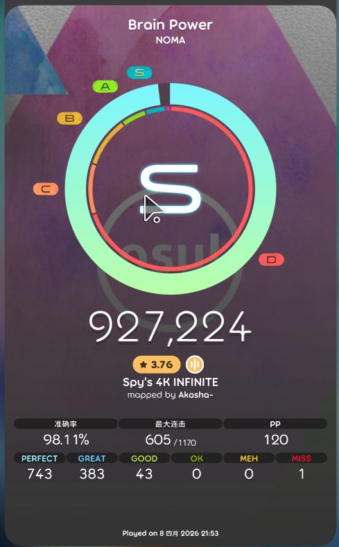 现在基本都是专注osu跟偶尔打打街机了