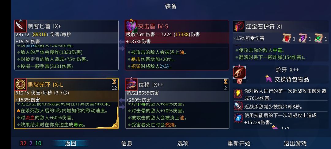 装备:刺客匕首 突击盾 位移 堕落力量或撕裂光环 变异:(优先度)杀戮天性-谋划-冷血无情-主动出击- 连击-开放性伤口-武器大师-速度 种子:红流种就行 我用的792769 这是路线:https://www.taptap.com/moment/200763275963532079 tip:1.可以把匕首换成蛇牙因为↓ 2.虫母和巨人触发不了刺客匕首的暴击 3.小怪中的刺刺(位移➕突击盾,别a,因