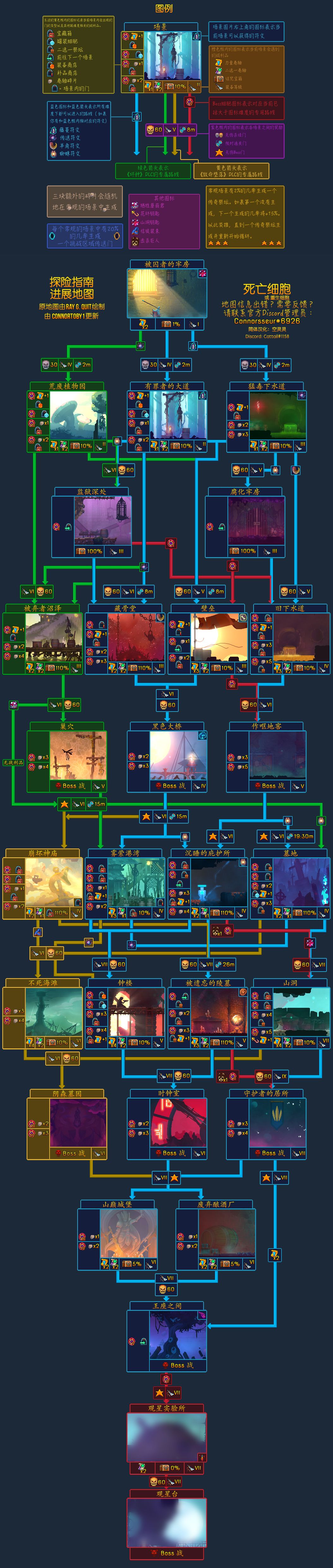 五细胞已通,给新手的tips 1.不建议玩彩虹流(太刮)和紫流(太脆) 2.可能是因为设备原因,手机端上并没有自定义符文。所以新手开荒时,千万不要用宝贵的细胞解锁太多奇奇怪怪的东西(触手警告),可以攒细胞到传奇锻造厂锻造武器或者解锁变异。这样到高细胞时,不会非常吃力。 3.不要整天想着摆弄你手上那破旧的咒刀,不管伤害多高,菜鸡还是菜鸡。前期推荐走绿流,血量厚,还有巨镰这种特别快乐的武器;或者拿电鞭,自动瞄准,除了后期很刮,前期很快乐 4.一定要走下水道路线,简单,卷轴多,新手不建议去植物园(我到现在还没有一次在四细胞活着走出去) 5.手搓玻璃的游戏体验,肯定是比用键盘或手柄要差的,所以有条件的可以买手柄(都有这闲钱,你还不如买端游) 6.一定要在低细胞时集齐所有符文 7.打王手时不要带和减速有关的任何东西,不然你会感受到痛苦的;同时,不要觉得喝了万灵药你就无敌了,喝药家还是能一巴掌把你打到残血;在打时守和巨人时,建议带上盾 8.壁垒:被群殴时保命的超人 雷盾/惩罚(是叫这个吧?):伤害很高 9.现版本高细胞,金武还不如普通武器,浪费一个卷轴位。 10.不要怂,咒箱和挑战一定要开 11.闪退大法,没有存档大法好用 12.最后,引用游戏中的一句话:菜就多练练 以上就是我所能想到的所有要点,希望能帮助到你 PS:下图为当前版本流程图