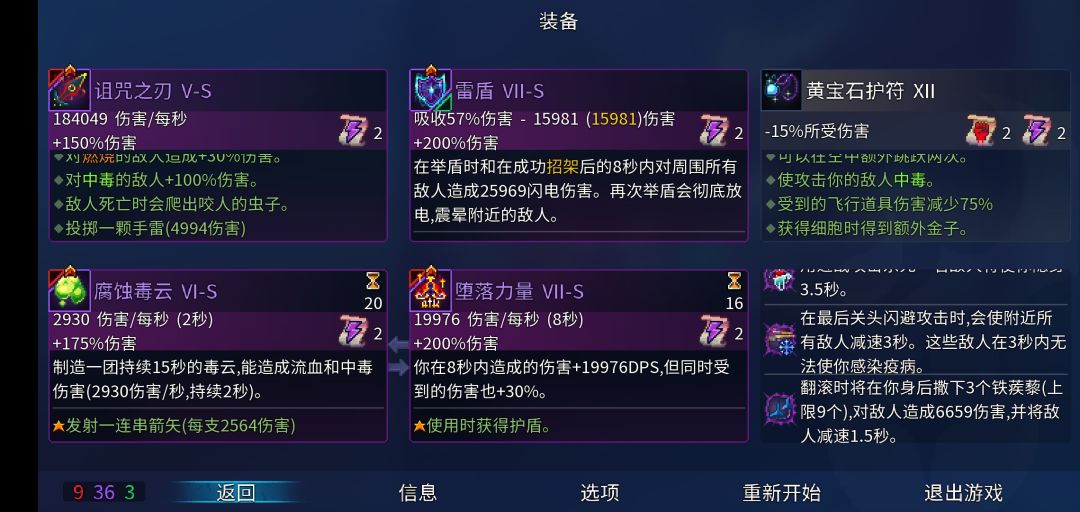 最后整个武器等级,卷轴选择,装备搭配介绍,我刚玩是对这个很迷茫,现在搞懂了出来解放萌新思路 1.武器等级 这个是影响伤害加成和词条数量,等级越高伤害加成越高,举个例子,高级咒刀和低级咒刀本身可以差6个卷轴也就是6*15%的伤害,所以尽量选高级的 2.武器词条 大部分人都会被直接加成的伤害欺骗却忘记了各种状态加成的词条 这个中毒词条堪比双倍伤害,所以我个人强烈推荐这个词条,刷出来红,紫流都可以用,要